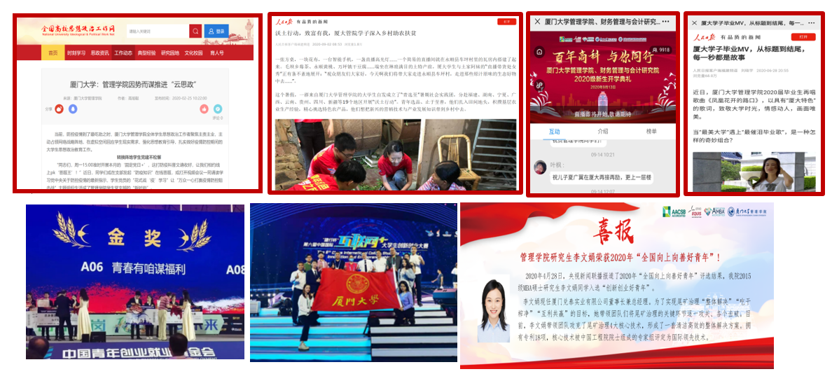 我院 “青选至”实践团队获2020年福建省大中专学生志愿者暑期“三下乡”社会实践活动优秀团队;2020届毕业生李文娟荣获2020年“全国向上向善好青年”;学生参与第六届中国“互联网+”大学生创新创业大赛,1位获国赛亚军,10位获国赛银奖,13位获省赛金奖,1位获省赛银奖,13位获省赛铜奖;学生团队获第十二届“挑战杯”中国大学生创业计划竞赛国赛银奖、省赛金奖,获“正大杯”大学生创新创业实战营销大赛国赛金奖。学院各类活动获得全国高校思想政治工作网报道3次、人民日报报道1次,原创制作《凤凰花开--管理学院2020届毕业MV》获人民日报全文转发,浏览量超68万。