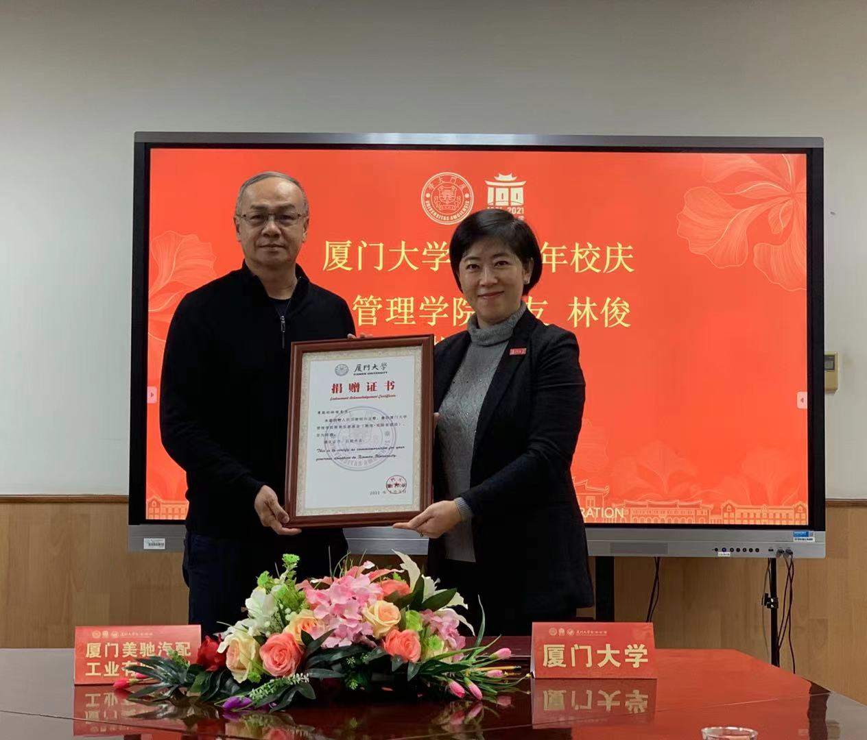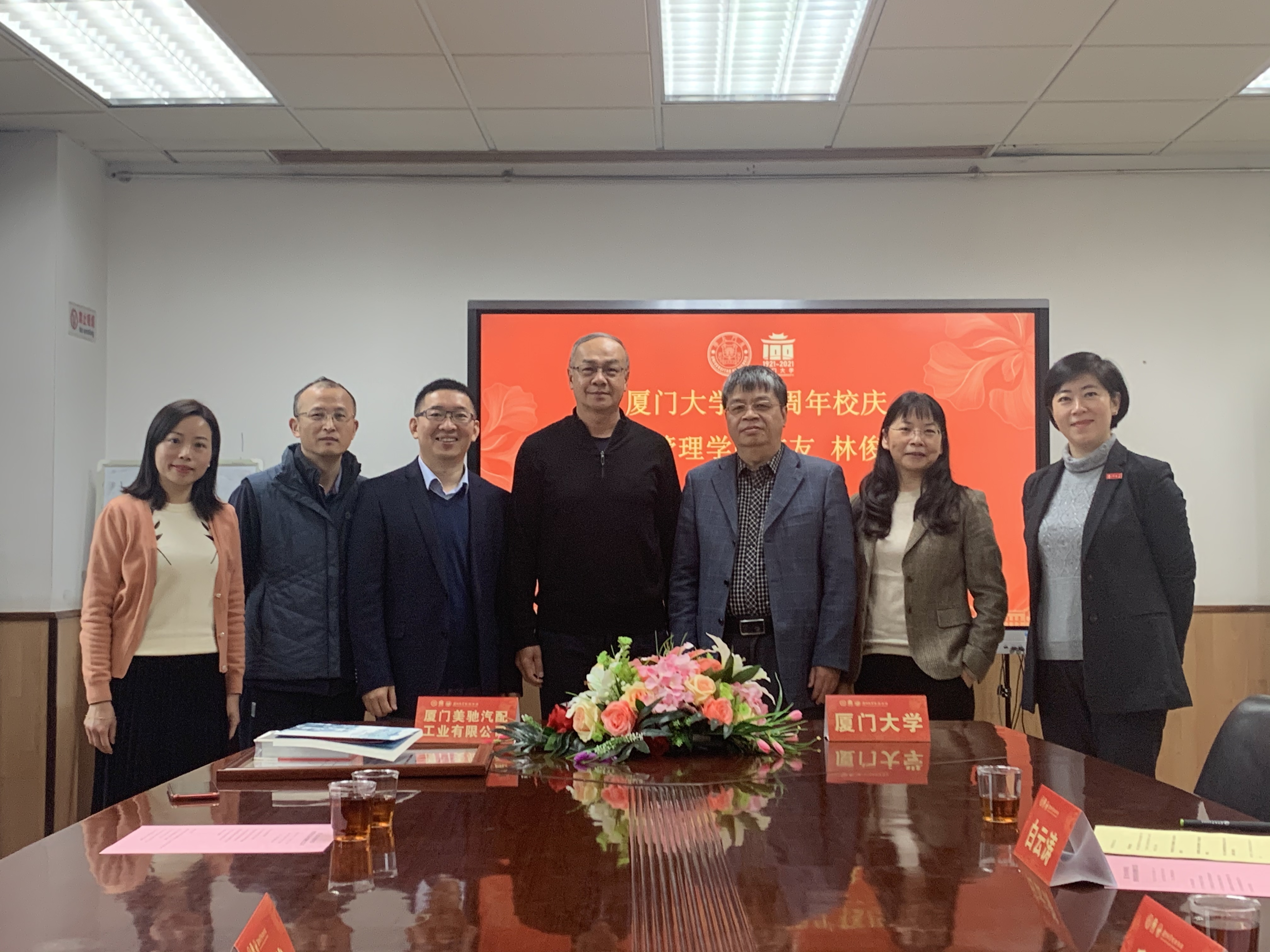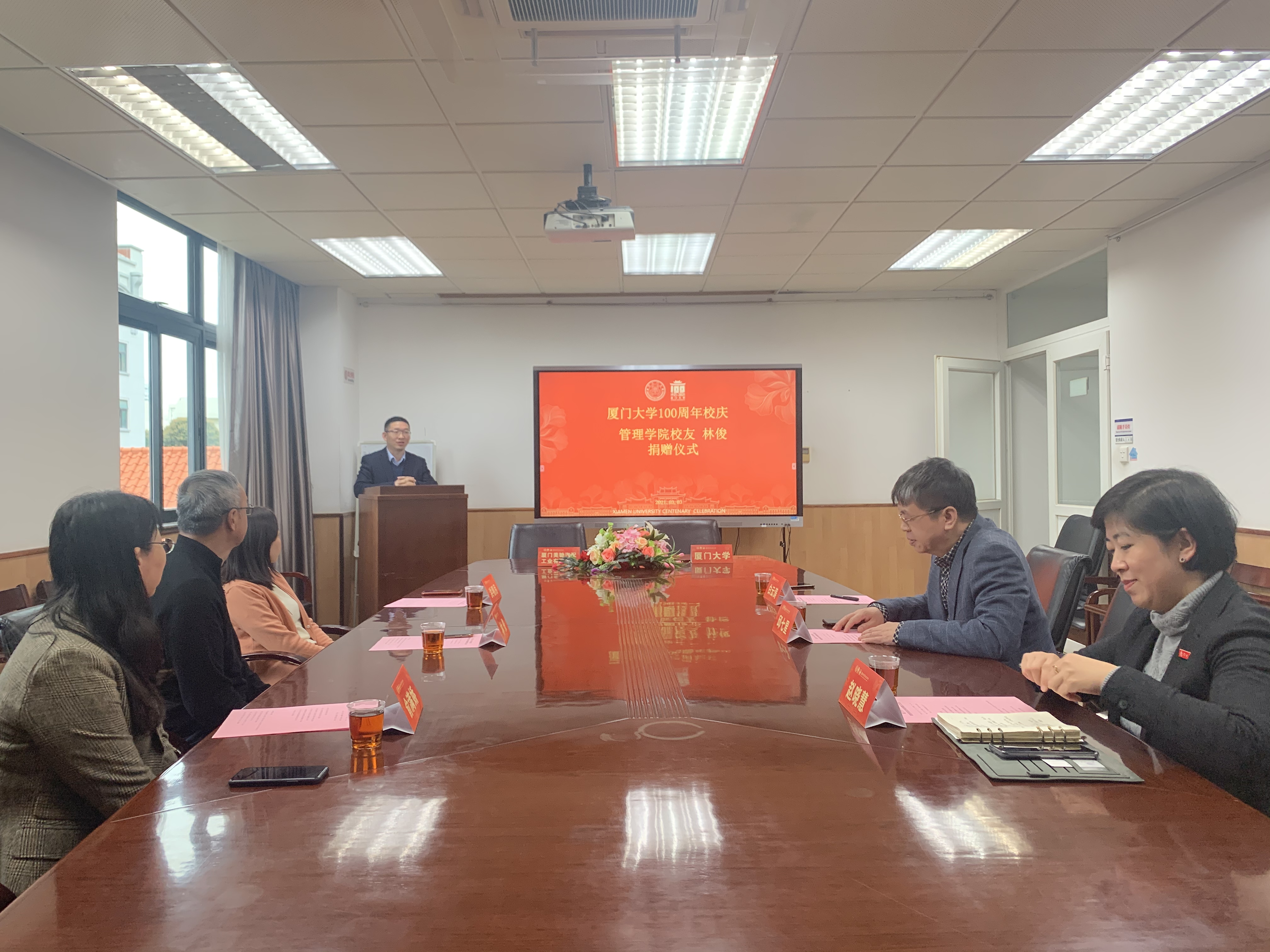 3月3日,管理学院企业管理系1981级/EMBA2003级校友、厦门美驰汽配工业有限公司林俊董事长向管理学院发展基金捐赠一百万元人民币,献礼厦大百年华诞,支持学院教育发展。捐赠款项将用于学院教室和实验室建设,助力学院提升教学硬件,以实际行动践行嘉庚精神,传承厦门大学感恩文化。当天下午,捐赠仪式在嘉庚一301会议室举行。林俊校友、厦门大学教育发展基金会副秘书长赵晓慧、管理学院党委书记邱七星、EMBA中心副主任俞满娇等出席了捐赠仪式。仪式由管理学院副院长、企业管理系主任白云涛主持。