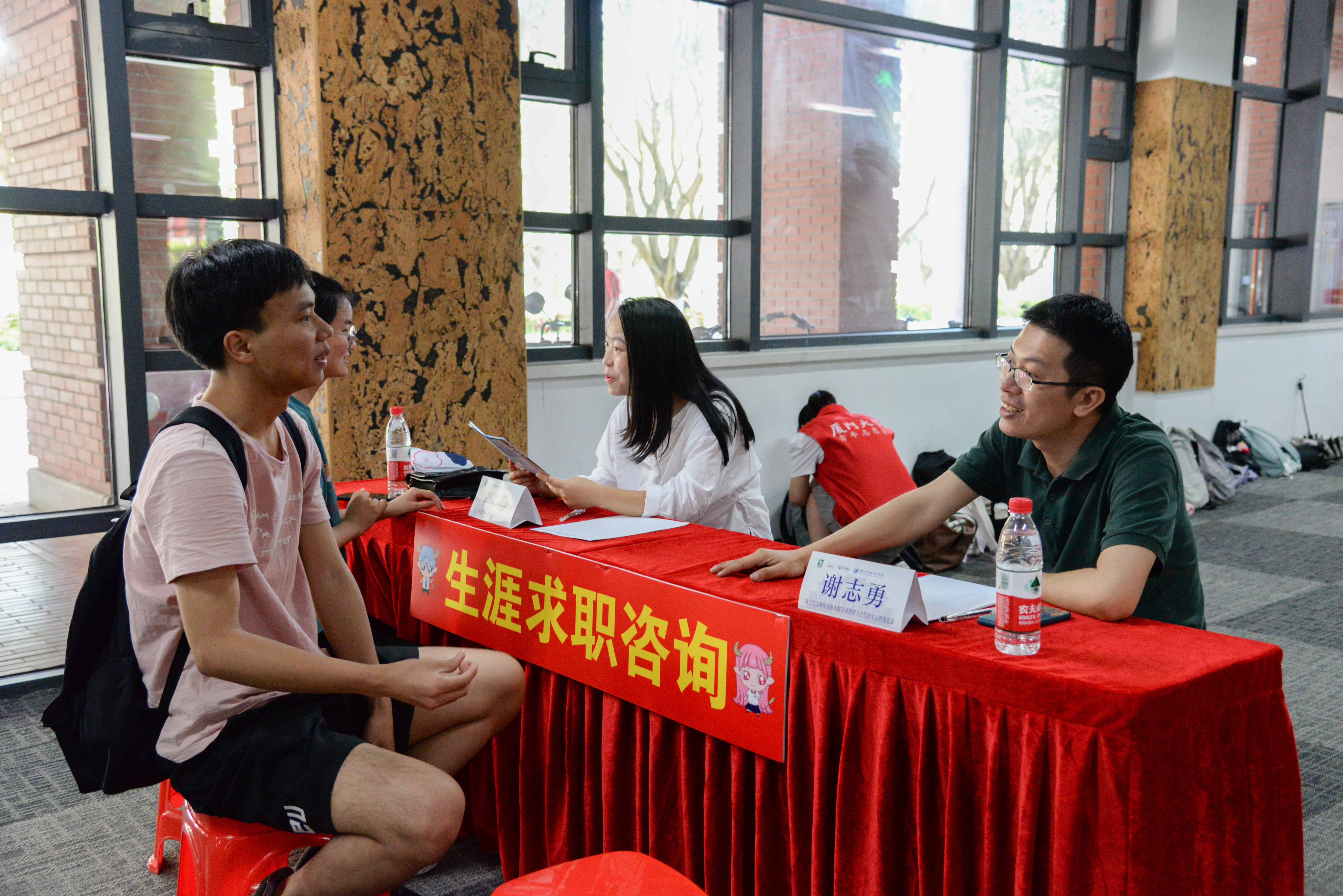 厦门创思特管理咨询有限公司合伙人严静、四三九九网络股份有限公司人力行政中心资深总监谢志勇为现场同学们进行生涯规划咨询和简历修改指导。谢志勇总监表示,应聘者们都很热情,招聘会在志愿者的引导下也很有序。他为数十位同学们提供了简历修改建议和求职规划帮助,并充分肯定了本次活动的积极影响。