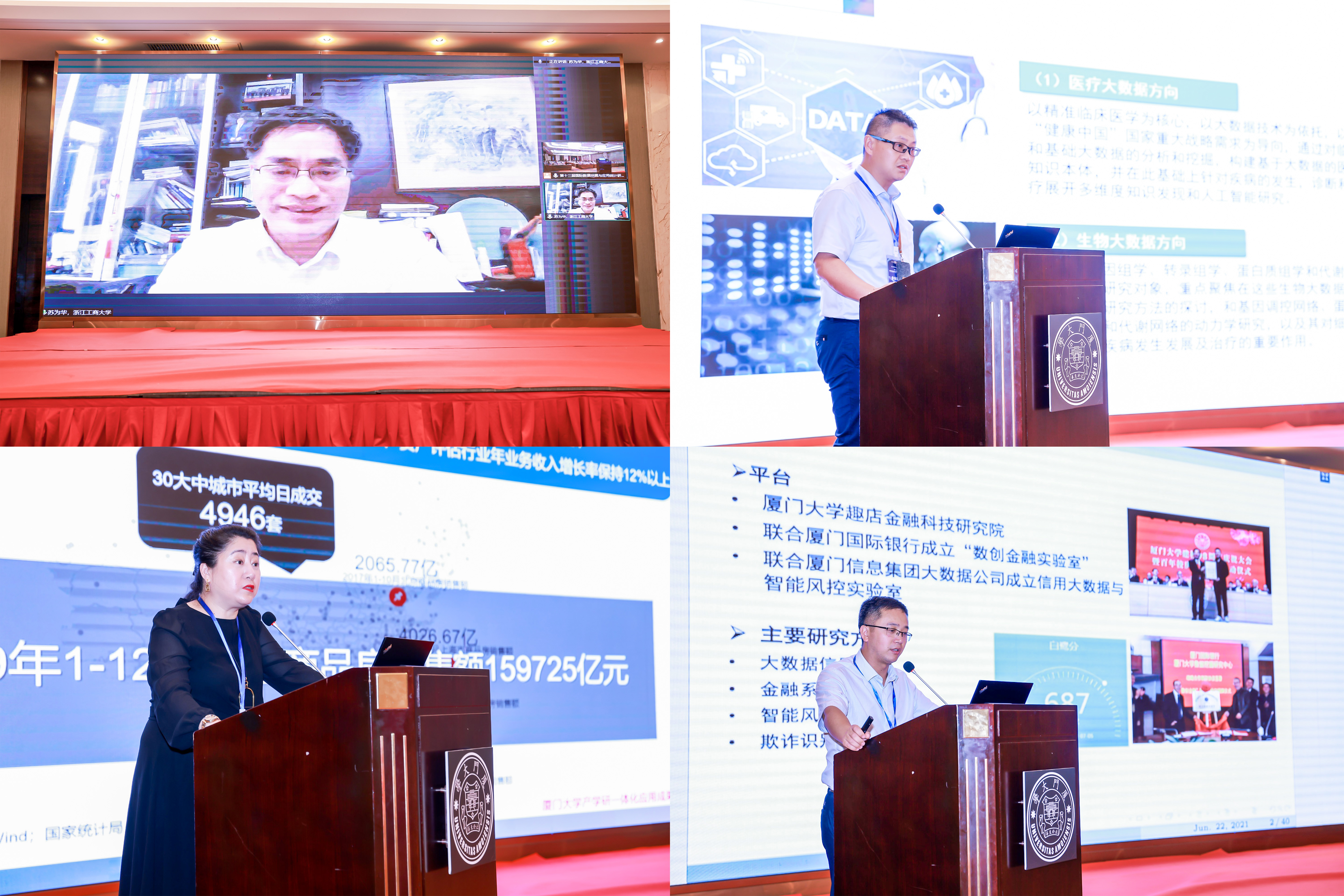 开幕式后,南开大学统计与数据科学学院执行院长、长江学者、国务院学位委员会统计学科评议组成员王兆军教授,做了题目为“新时代下的统计人才培养”报告;厦门国际银行首席信息官王鹏举先生,做了题目为“厦门国际银行金融科技数字化转型和智能化应用”的报告;浙江财经大学书记、教育部高等学校经济学类专业教学指导委员会副主任委员李金昌教授,做了“共同富裕的统计解读”报告;上海对外经贸大学校长、国务院学位委员会统计学科评议组成员、教育部高等学校统计学类专业教学指导委员会副主任委员汪荣明教授,做了题目为“大数据背景下健康保险的统计精算建模研究”报告;浙江工商大学副校长、教育部高等学校统计学类专业教学指导委员会委员苏为华教授,在线远程报告了“基于线上线下相结合的工业企业电子商务销售规模‘脱敏’调查估算——浙江省金华市的试点经验介绍”;厦门大学健康医疗大数据国家研究院副院长李奇渊教授,报告了“大数据赋予医疗技术和健康管理的全新模式”;厦门云评众联科技有限公司总裁、董事长李秀荣女士,汇报了“数字地产与数据新动能”;厦门大学数据挖掘研究中心副主任、经济学院方匡南教授,做了题目为“Community influence analysis in social network”的报告。