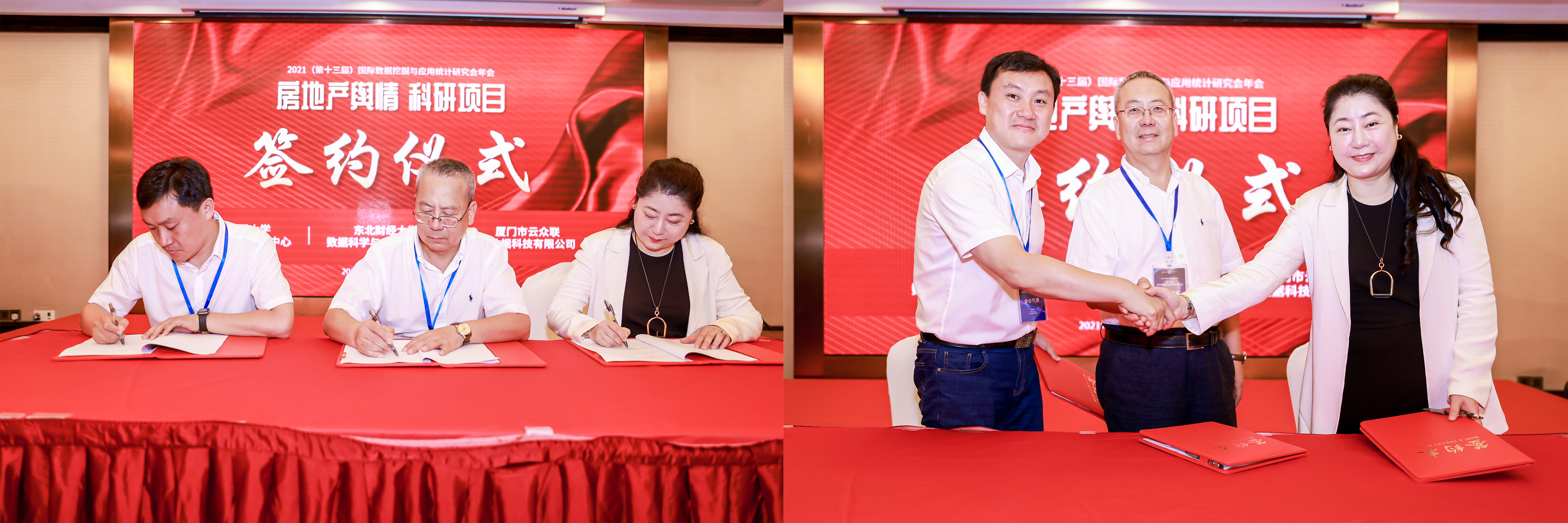 年会设置六个平行分会场,有来自高校和企业的58位代表分享了他们近期的研究成果。分会场一为大数据与数据科学专场,报告主要涉及文本大数据、图像文本识别、深度学习算法应用和指数构建等。分会场二为统计理论与方法专场,报告主要涉及多视角学习,函数数据分析,分位数回归,奇异值分解,贝叶斯理论,现状数据降维等。分会场三为经济统计发展前沿专场一,报告主要涉及数字经济影响,城市经济效率测度,产业集群发展,收入分配的消费影响等。分会场四为经济统计发展前沿专场二,报告主要涉及区域经济发展、疫情后经济恢复、互联网大数据经济等。分会场五为数字金融与金融科技专场,来自商业银行、金融科技企业和高校的代表分享了在大数据普惠金融时代,知识图谱和自然语言处理等人工智能关键技术在个人信用风险和系统性金融风险的实践及案例分享等。分会场六为在数字地产与数据新动能专场,厦门大学数据挖掘研究中心朱建平教授、东北财经大学数据科学与人工智能学院徐建教授和厦门市云众联大数据科技有限公司董事长李秀荣为代表进行了房地产舆情科研项目合作签约仪式,共同研讨“房地产舆情”为房地产金融市场带来的数字化转型和机遇。该专场报告主要涉及信用大数据、数字化转型、生态福利绩效、绿色发展、创新策源能力和住房需求等。