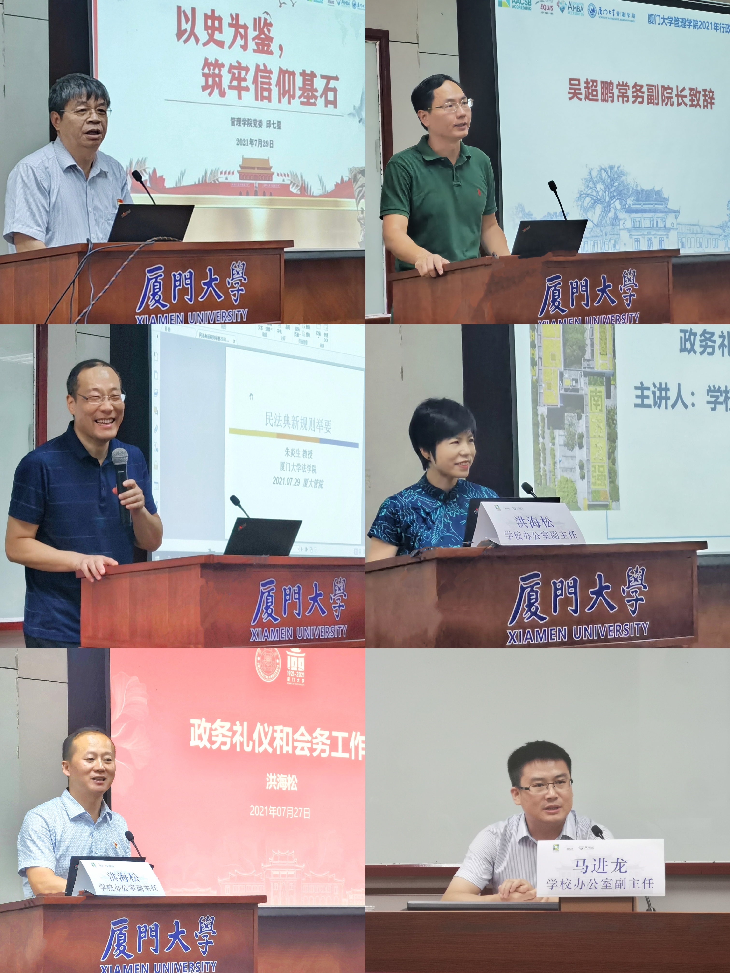 此次培训邀请到管理学院邱七星书记、法学院朱炎生教授、学校办公室洪海松副主任和马进龙副主任先后为全体行政人员做专题报告。培训内容包含党史学习、法律知识、政务礼仪与会务、公文写作等。