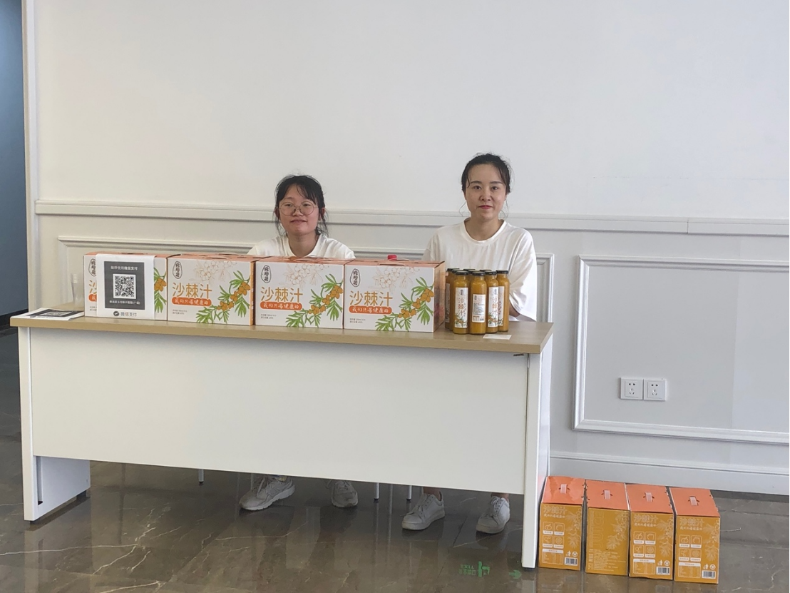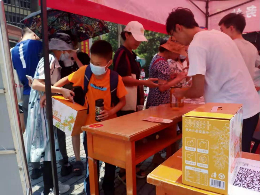 活动当天,团队成员早早在三家村广场搭建好了销售场地,活动吸引了大量师生前来围观购买。团队成员积极为大家介绍沙棘汁,科普其益处,让更多人了解到这一宁夏特色产品。在得知沙棘汁滞销的情况后,在场师生纷纷倾囊相助,为促进乡村振兴贡献一份力量。
