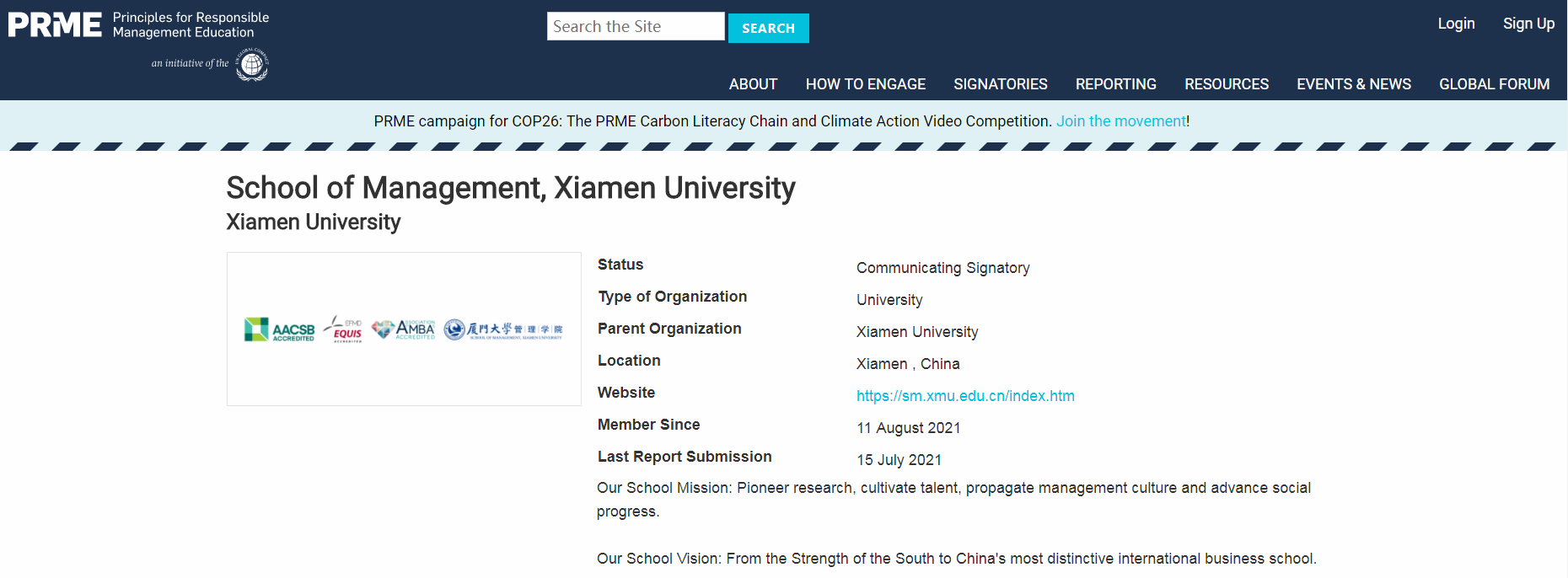 2021年8月11日,联合国全球契约官方发布:厦门大学管理学院正式加入联合国全球契约组织“责任管理教育原则”(简写为PRME)。信中提到:“欢迎厦门大学管理学院加入PRME,这是一个已有来自99个国家的860多个商学院和管理教育机构的国际大社区,通过六项原则与经管学院合作,保障管理教育机构为未来的领导者提供平衡经济和可持续发展目标所需的技能,同时,也呼吁人们关注可持续发展目标【the Sustainable Development Goals (SDGs)】,使得教育机构与联合国全球契约(UN Global Compact)的工作契合”。后于9月21日,PRME秘书处正式确认厦门大学管理学院可以使用PRME的官方LOGO标识。