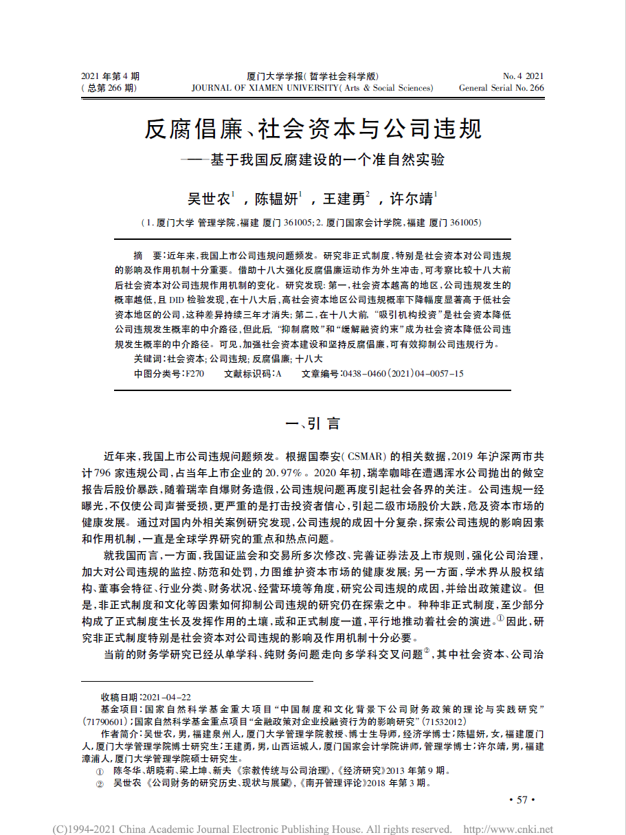 我院财务学系吴世农教授、2018级财务学系博士研究生陈韫妍、厦门国家会计学院讲师王建勇、2016级财务学系硕士研究生许尔靖合作撰写的论文《反腐倡廉、社会资本与公司违规——基于我国反腐建设的一个准自然实验》,在《厦门大学学报(哲学社会科学版)》2021年第4期正式刊出。