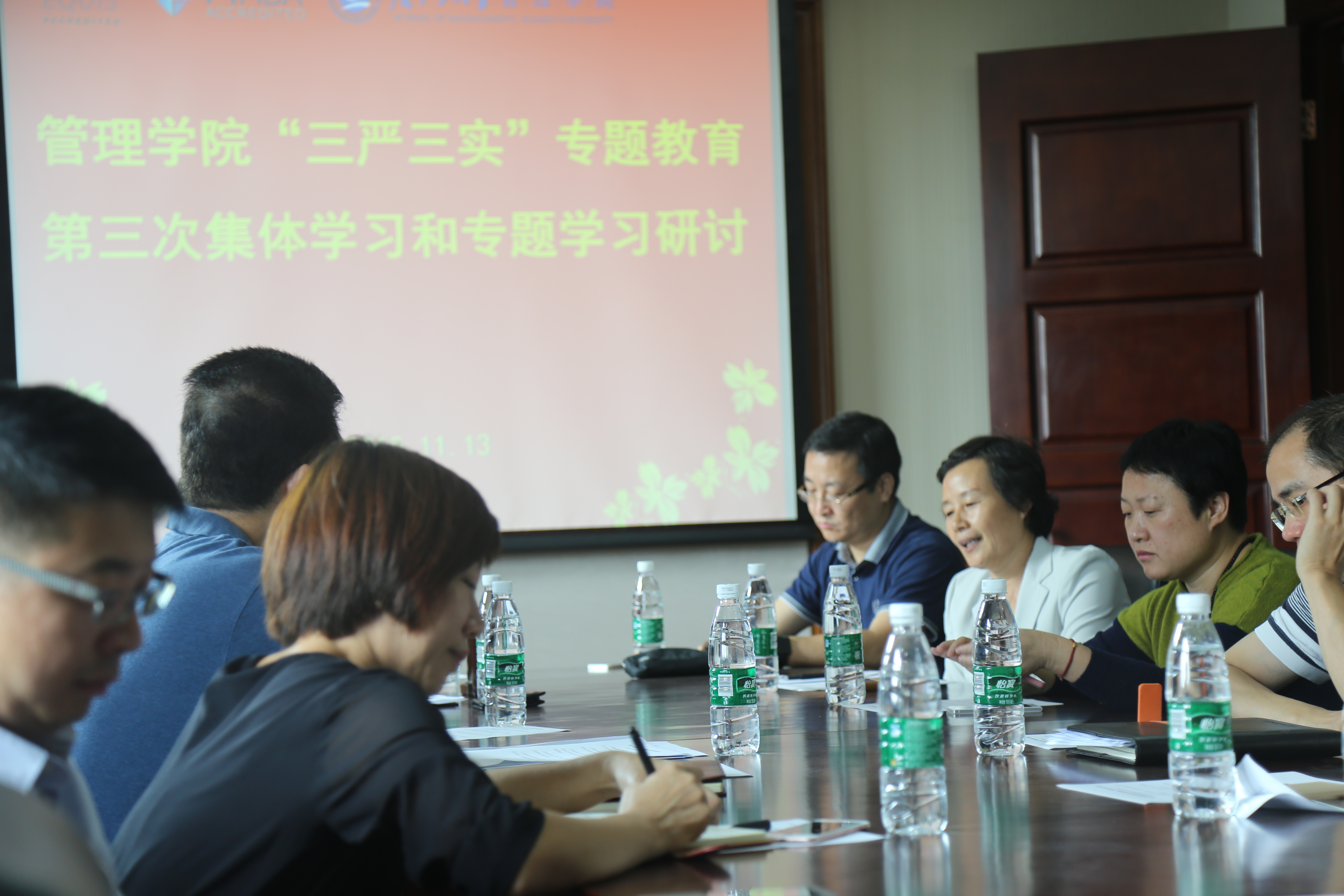 2015年11月13日下午,管理学院党政领导班子在保欣丽英楼(嘉庚一)五楼国际认证会议室举行“三严三实”专题教育第三次集体学习和专题学习研讨。学院党委委员,教工支部书记、支委代表,教师及行政党务人员代表出席了会议。院党委书记沈维涛主持研讨会。