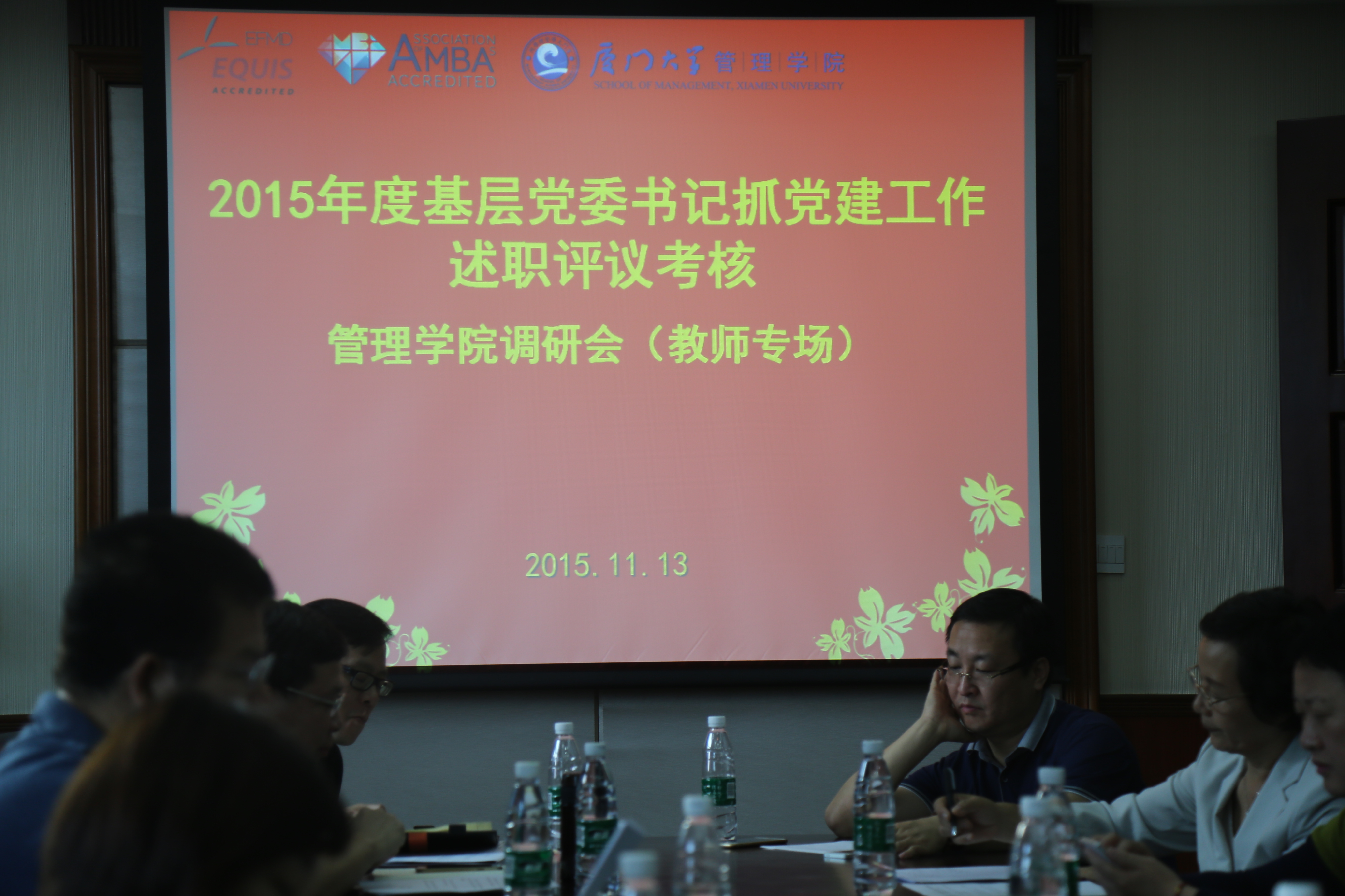 11月12日、13日下午,管理学院分别在保欣丽英楼(嘉庚一)302会议室、五楼国际认证会议室举行2015年度基层党委书记抓党建工作述职评议考核师生调研会。学院党政领导班子,党委委员,教工支部书记、支委代表,教师及行政党务人员代表出席了会议。会议由学院党委书记沈维涛主持。