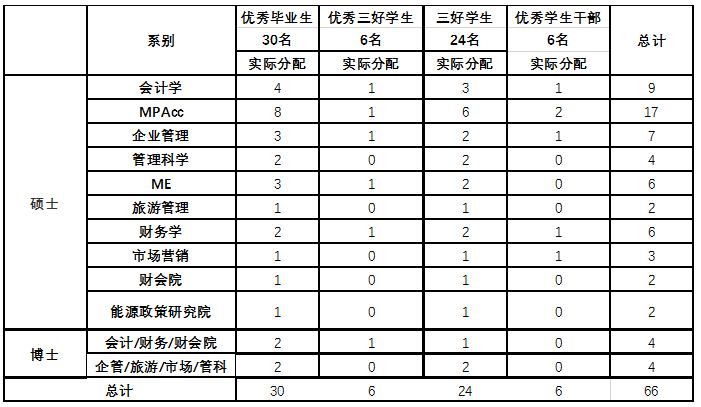 学校分配给我院的“优秀毕业生”、“优秀三好学生”、“三好学生”、“优秀学生干部”名额分别为30、6、24、6名,我院根据班级人数比例具体分配如下: