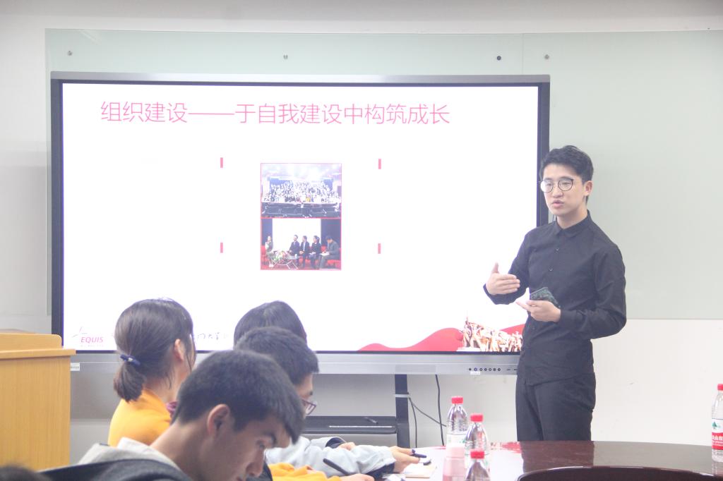 首先,于浩淼向兄弟院校的师生们介绍我院学生会的基本情况。他先从学生会的组织建设和组织结构入手,阐述了学生会的整体情况,还强调了今年学生会组织架构的创新变化,并进一步从职能角度详细介绍了管理学院学生会的“七部门一中心”。之后,他详细阐述“七彩”系列活动的持续推进与创新,并介绍了我们院主办的主要赛事和活动。最后他以学生会年会等活动为例,介绍了学生会的文化和团队建设。