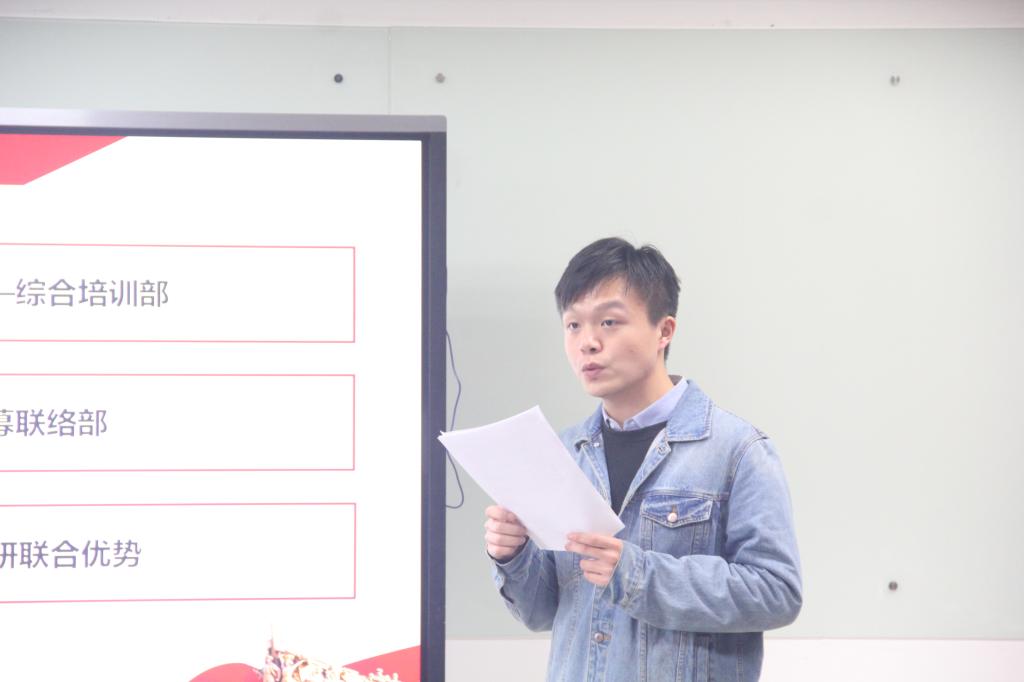 青年志愿者协会会长翁承武从志愿服务组织和志愿服务项目两个角度对管理学院青年志愿者协会作出详细介绍。他介绍了青协四个部门的组织结构和其独特的轮岗制度,阐释了宣传推广部、招募联络部、管理服务部和综合培训部四个部门的职能分工。他还对青协组织的志愿服务项目做了详细阐述,并且介绍了青年志愿者协会具有亮点的品牌建设和团建活动,以及青协在各种活动中所发挥的作用。最后,他也同样对青协的未来提出了建议,并向兄弟学院发起了合作邀请