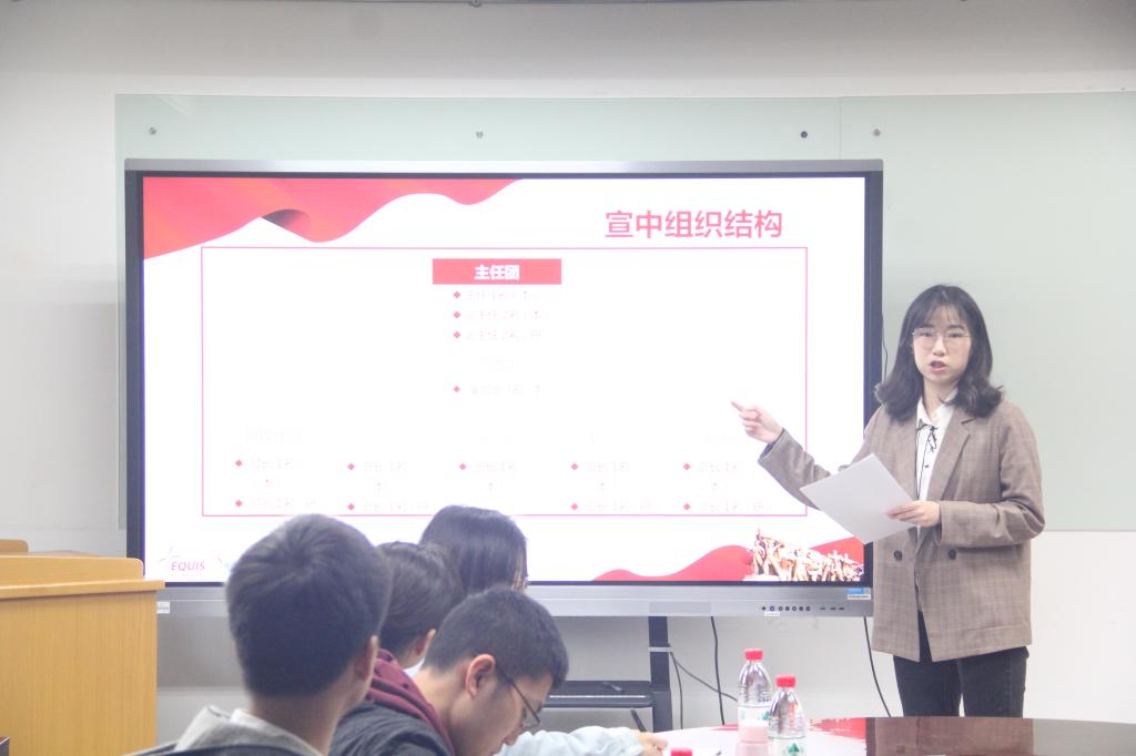 管理学院学生宣传中心主任阮琳槟对宣中的组织建设和工作成果作出报告。首先,她介绍了学生宣传中心的大体组织结构,再具体阐述了主任团、新媒体部、视创部、杂志社、美工部、采编部和综合部的架构和职能分工,特别强调了主任团和综合部对接、主任团由综合部选拔的特殊机制。随后,她向大家介绍了宣中近年来的重大成果,包括各大宣传平台的运营情况以及所获得的奖项。在报告的最后,她总结并提出了宣中未来的改进和创新方向。