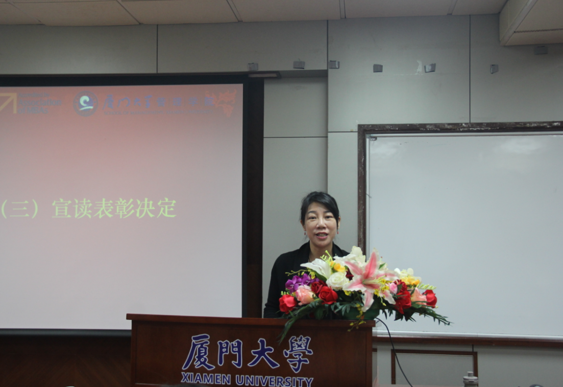 洪秋霞老师在大会上宣读了表彰决定,孙佳、江娇、吴荣梅、吴光锡、邵亢邑、刘晓宇为获得2016年度“管理学院优秀青年志愿者”的同学颁发奖状。