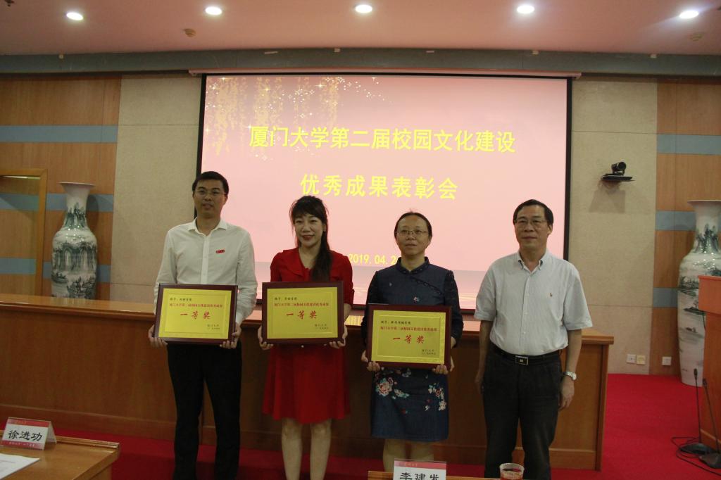 4月26日下午,由校党委宣传部、学生工作部(处)、校工会、校团委联合举办的厦门大学第二届校园文化建设优秀成果表彰仪式在颂恩楼220报告厅举行,由管理学院报送的《“管理大世界”网络文化品牌建设》获得一等奖,学院党委副书记洪秋霞代表学院领取奖状,作为全校四个发言代表之一,学院团委副书记吴光锡作题为《举旗定向,同心育人——“管理大世界”网络文化品牌建设》的工作汇报。