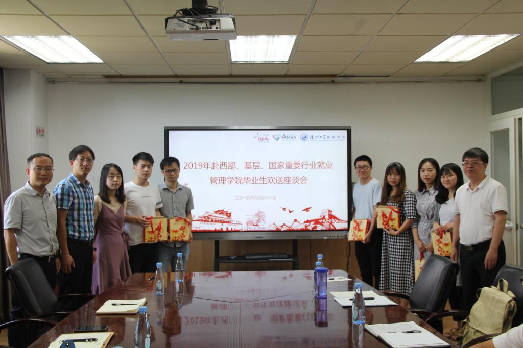 6月21日,管理学院2019年赴西部、基层、国家重要行业就业毕业生欢送座谈会在嘉庚二301会议室举行。学校学生处副处长高斌,学院党委书记邱七星、党委副书记戴蓥、团委书记江娇、团委副书记周颖、辅导员刘晓宇,2019届本硕博毕业生代表,2017级、2018级本科生代表出席了此次座谈会,座谈会由企业管理系2015级本科生苏菲菲主持。
