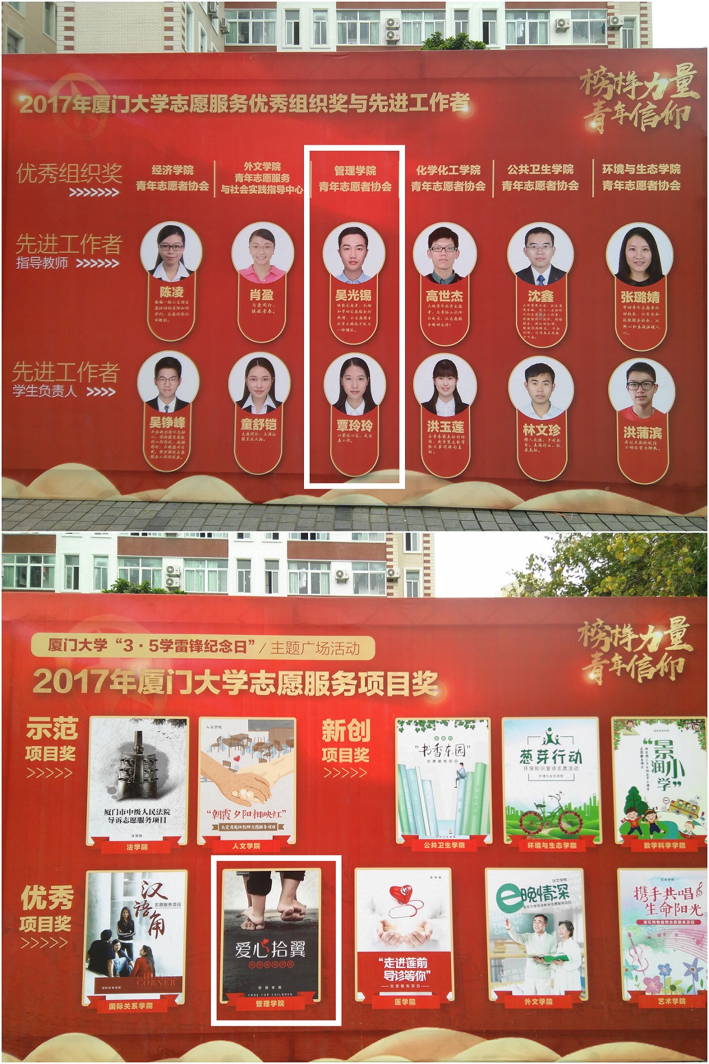 近日,学校公布了2017年厦门大学十佳志愿者、十佳志愿者提名、优秀志愿者,志愿服务优秀组织奖、志愿服务先进工作者和志愿服务项目奖评选结果,管理学院在此次评选表彰中突破重围,斩获佳绩。