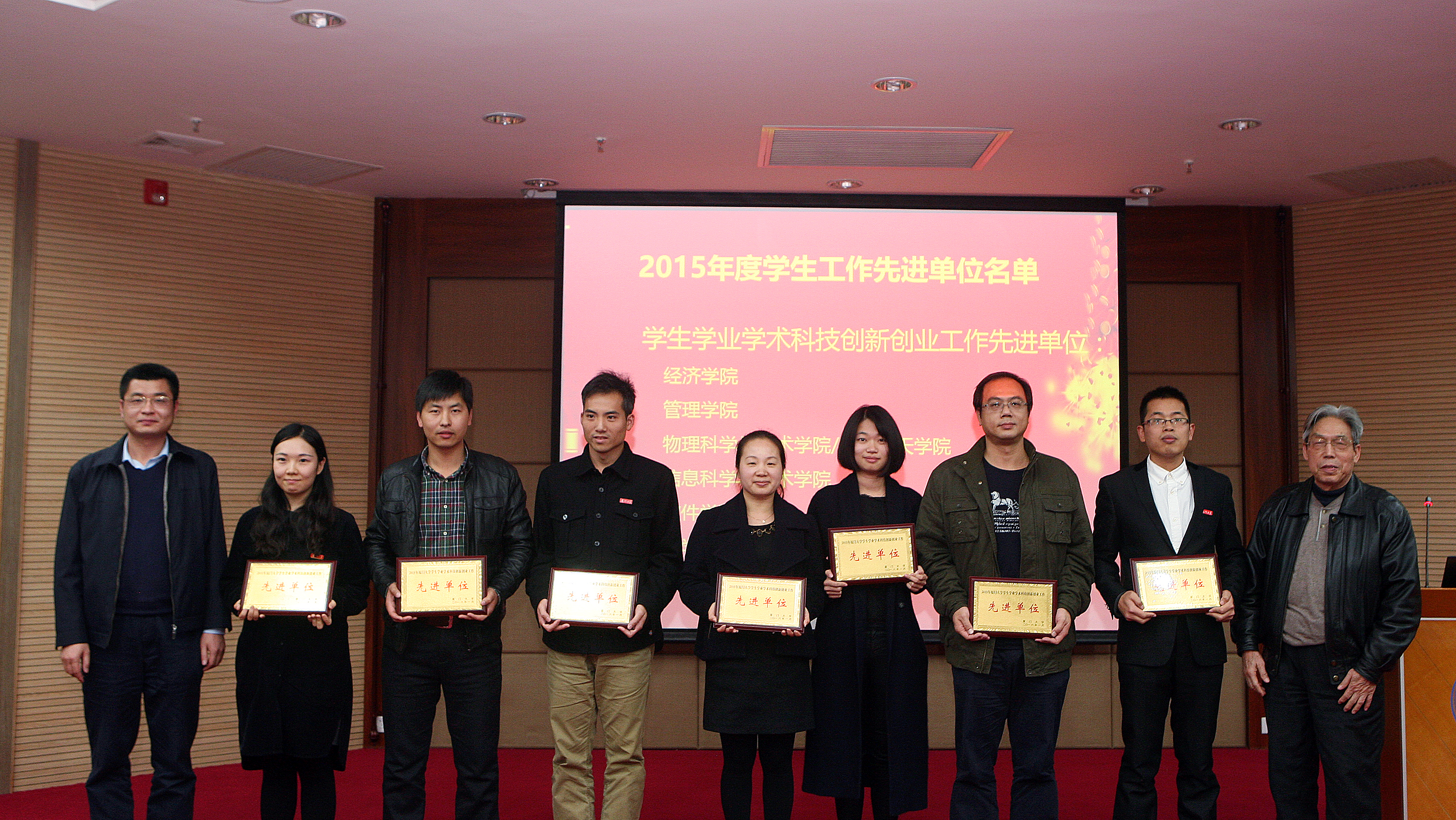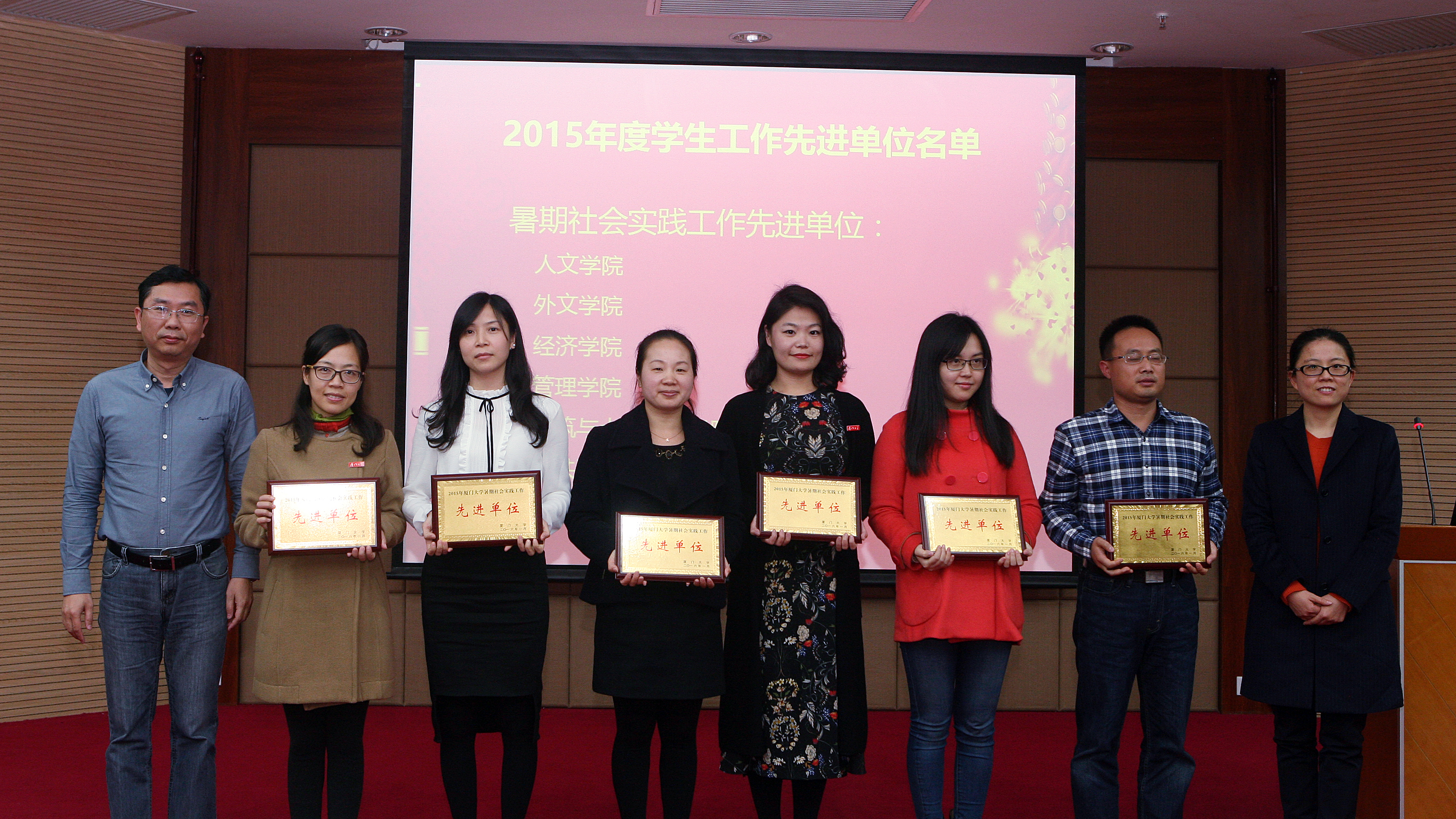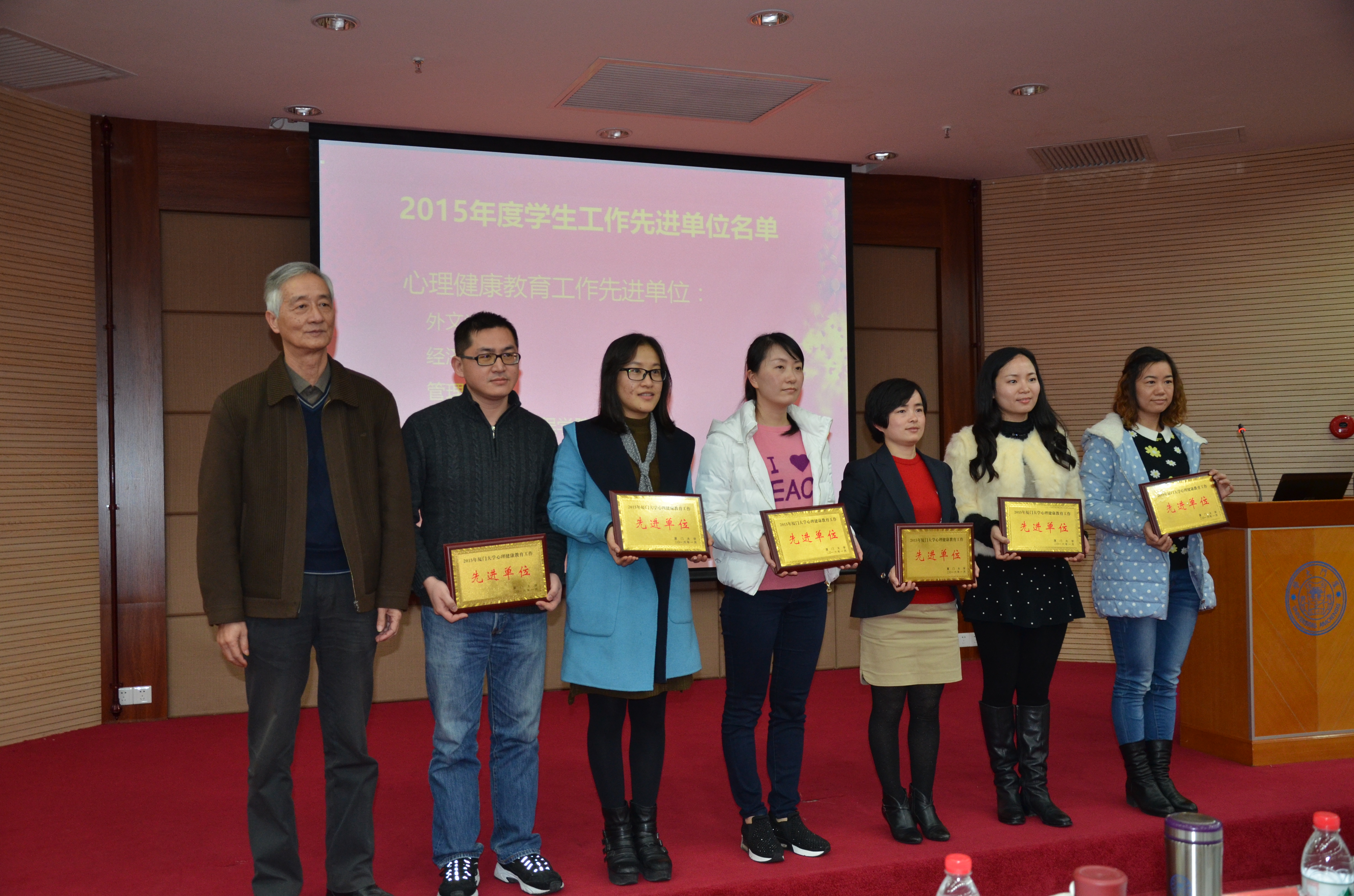 大会对2015年度学生工作先进单位和2015年考核优秀的辅导员进行了表彰。此次表彰共评选六类奖项:就业工作先进单位6个、心理健康教育工作先进单位6个、网络文化建设工作先进单位6个、学生学业学术科技创新创业工作先进单位6个、志愿服务工作先进单位6个、暑期社会实践工作先进单位6个。我院获评“就业工作先进单位”、“心理健康教育工作先进单位”、“网络文化建设工作先进单位”、“学生学业学术科技创新创业工作先进单位”和 “暑期社会实践工作先进单位”等五项表彰。学院辅导员吴光锡作为2015年考核优秀的辅导员受到表彰。我院是本年度获得表彰奖项最多的两个单位之一,彰显了我院学生工作的科学化水平以及在全校的引领示范作用。