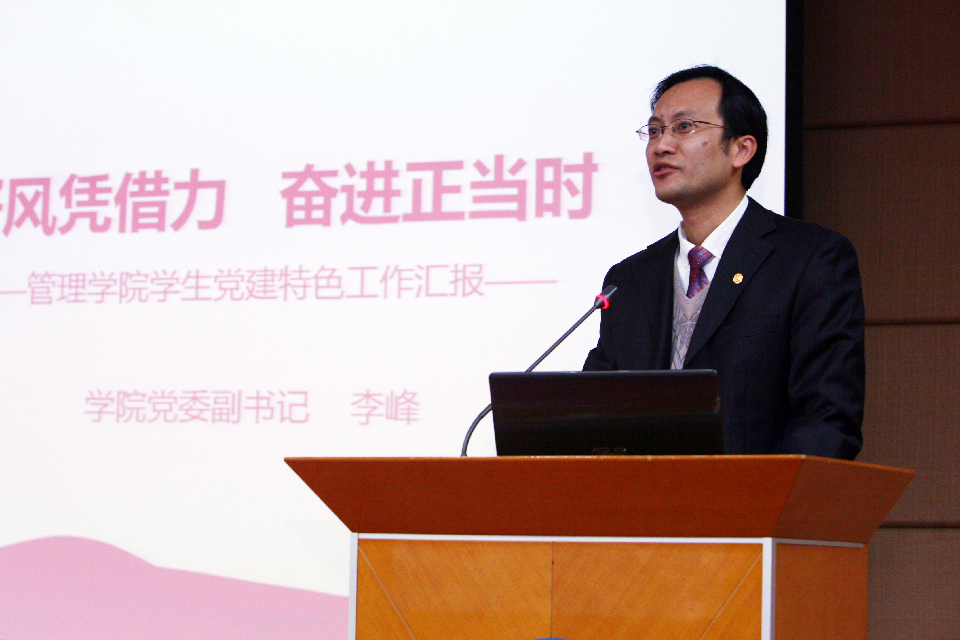 会上,各学院、研究院分管学生工作的党委副书记分别作了本单位学生特色工作交流发言,学生工作部(处)、校团委也分别就2015年工作进行总结和回顾。我院党委副书记李峰以《好风凭借力,奋进正当时》为主题进行学院学生党建特色工作汇报,阐述学院如何依托2011年7月成立的全校唯一学生党总支,主动融入校、院的中心工作及学生成长需求,凭“初心之力”、“精粹之力”、“持久之力”和“率行之力”,以“一个价值”、“两个品牌”、“三个工程”和“四个制度”为主线,努力打造具有坚定政治信仰、扎实专业基础知识、富有社会责任感的商学院学生党员。