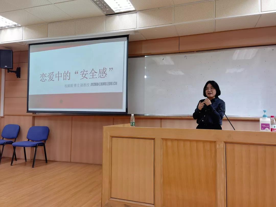 在讲座的开始,祝老师用“选座位”的例子引出了话题——“安全感”,从而提出“恋爱中也需要安全感”的观点。缺乏安全感的行为有很多,人在恋爱中一旦缺乏安全感,便有可能辗转反侧、焦虑不安。因此,祝老师向同学们讲解了与此相关的一些心理知识。