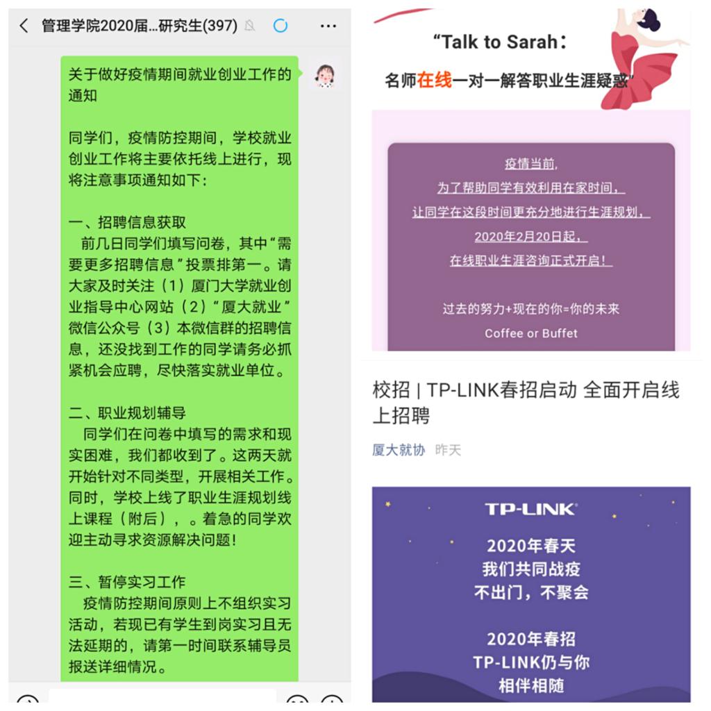 每年此时正是春季招聘如火如荼之际,如何抓住最后机会在“无接触线上面试”中突出重围、顺利收割,是毕业班同学们心头最关心的事情。受疫情影响,拓宽线上服务学生阵地系当前高校学生工作开展的要紧之事。为切实做好疫情防控期间学院2020届毕业生就业创业工作,管理学院及时转变工作思路,创新工作方式,充分利用校友资源、线上直播技术精准解决就业困难问题,努力做到就业指导与服务不断线,帮助毕业生顺利渡过招聘季。接下来,管理学院将通过开展线上职业生涯规划1v1指导、线下协助办理毕业生就业手续等方式,引导学生及时掌握就业政策信息,合理规划职业发展路径,缓解就业心理压力,全力保障2020届毕业生就业工作大局稳定。