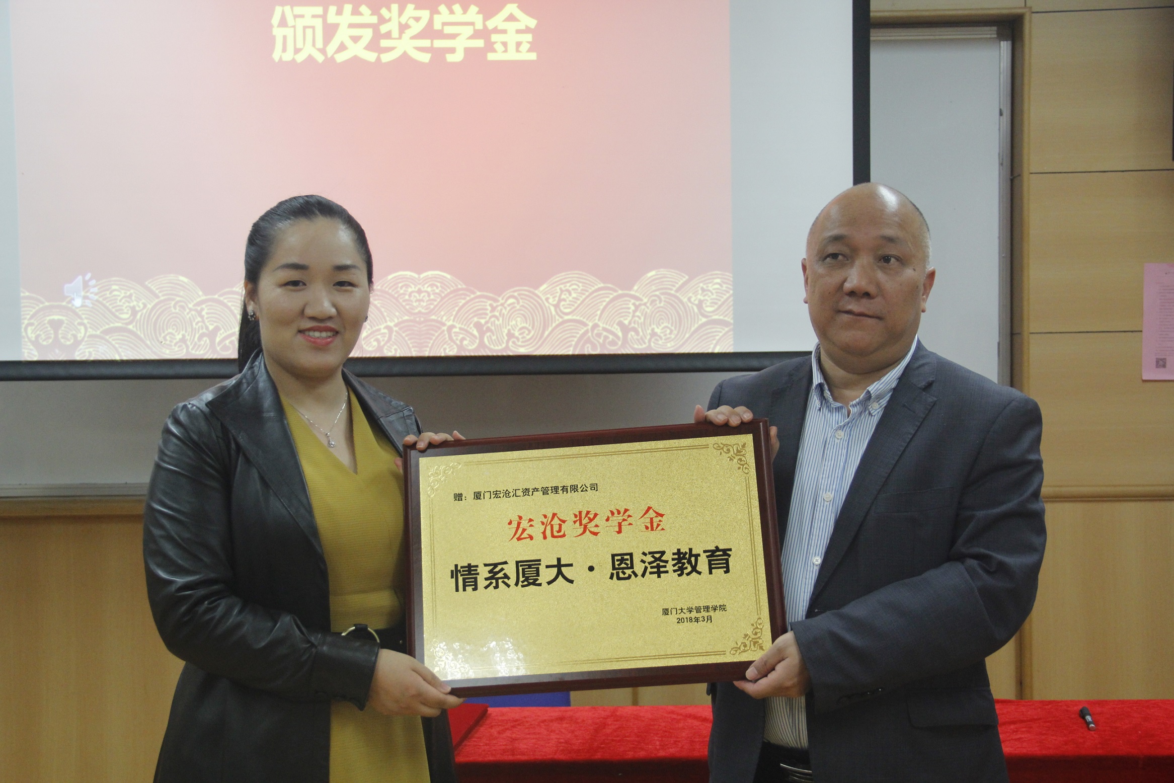 在播放了宏沧财富的简介后,宏沧财富创始人黄慧琴女士与旅游与酒店管理系系主任林璧属教授进行了签约仪式。随后,宏沧财富黄慧琴女士向管理学院党委副书记洪秋霞老师捐赠支票,并接受旅游与酒店管理系系主任林璧属教授的赠牌。