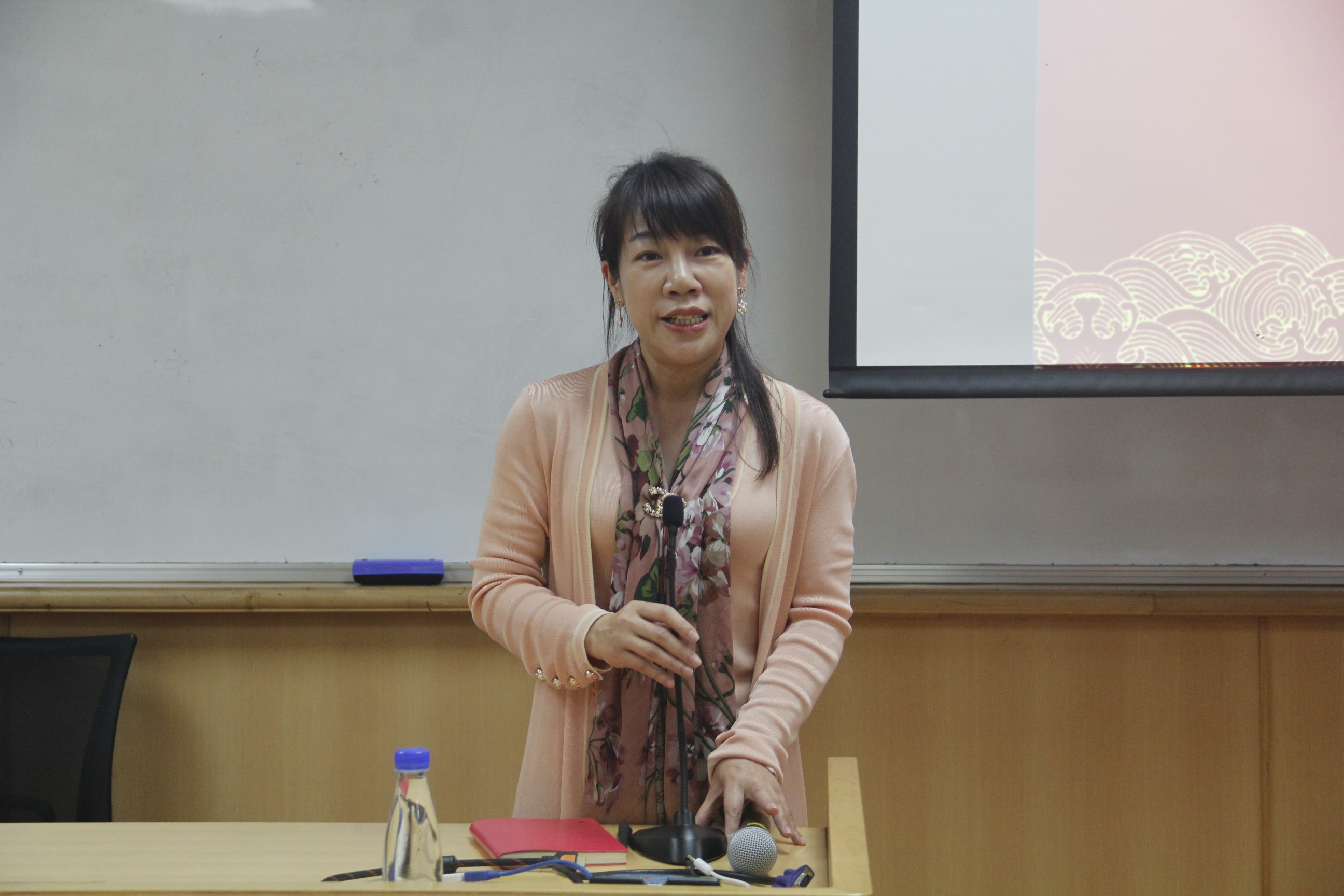 管理学院党委副书记洪秋霞老师在致辞中表达了对宏沧财富和旅游与酒店管理系各位老师的由衷感谢,并希望同学们向黄惠琴校友为榜样,努力提升自我,铭记母校恩情。