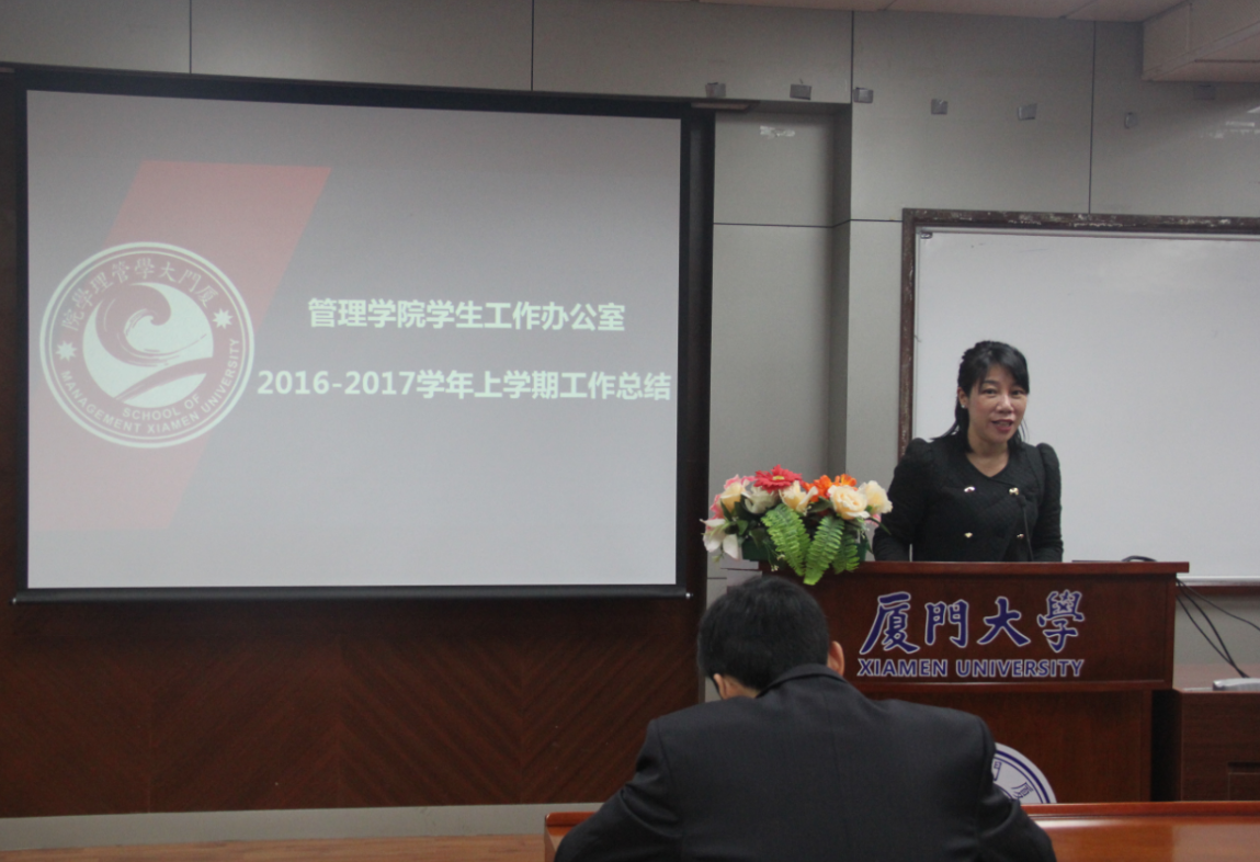 随后,洪秋霞老师对2016年的学生工作情况进行了简要的回顾。她指出,2016年,学院始终以打造“世界知名、国内一流、最具特色”商学院,以培育“五有青年”、加强“五彩管院”品牌建设为愿景,积极开展各项工作。同时,洪老师还从学生党团建设、宣传工作、学术科创能力、实践活动及志愿服务等几个方面总结了16年各项工作的实施情况,回顾了过去一年举办的学生党支部沙龙、“四进四信”团课活动、党支部书记培训班等重要活动,列举了学院囊获的多个奖项,强调学院微信、微博及易班宣传工作的继续发展,对志愿服务及心理健康建设等不足之处提出批评,并表示将在未来的一年里继续调整与改进。