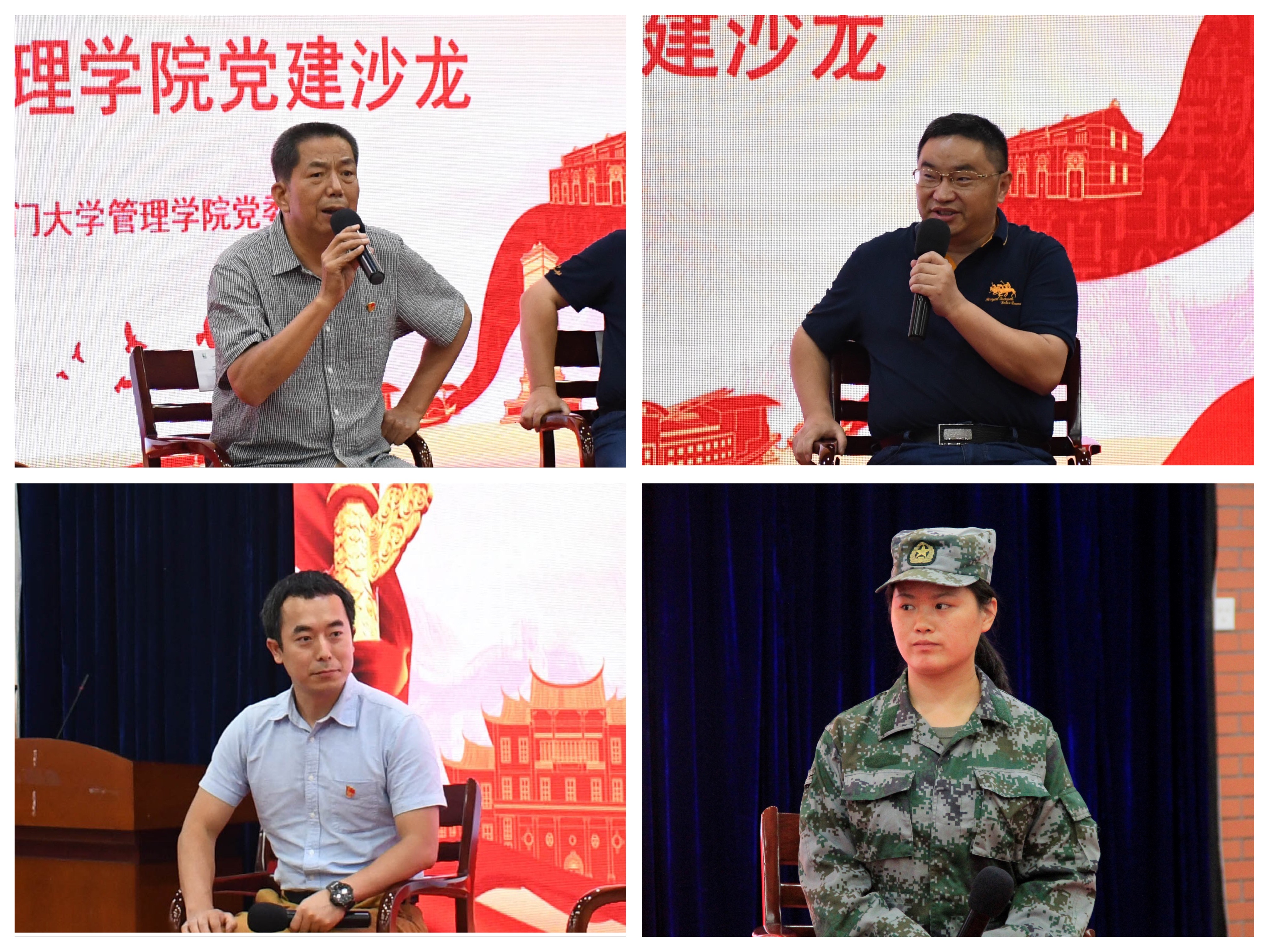 本次活动邀请了老中青三代优秀党员共聚一堂,分享入党初心和奋斗故事,畅谈党史教育与党员担当。受邀的四位分享嘉宾是厦门大学特邀党建组织员、基层党建工作联络员、管理学院原党委副书记黄定基,福建省青年五四奖章获得者、管理学院教授魏敏,全国高等学校创业教育先进个人、管理学院团委副书记揭上峰,管理学院退伍女兵、2019级旅游管理专业本科生彭派。
