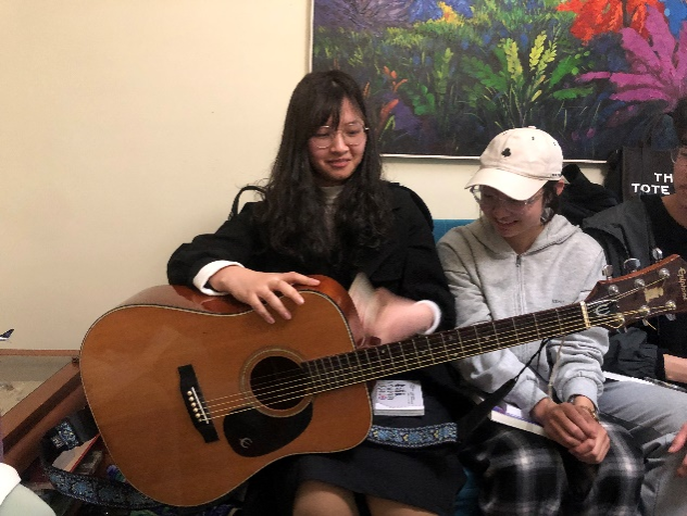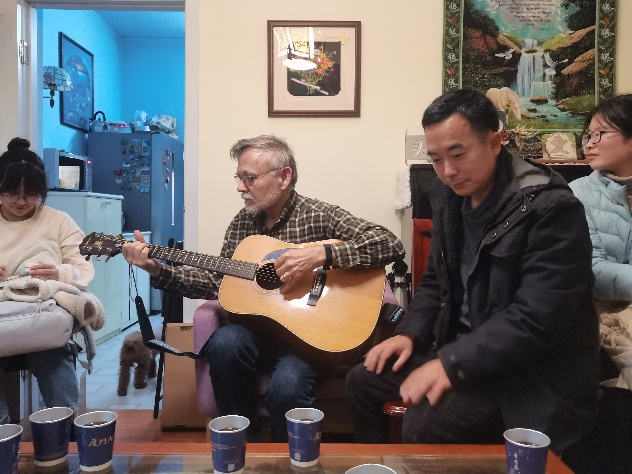 熟悉之后,同学们和潘老师开启了英语聊天模式。房间里有各式各样的乐器,六弦琴、十二弦琴、空音鼓、爱尔兰哨笛……潘老师如数家珍,向来访的同学介绍世界各种乐器,有的是自己手工制作,有的是朋友送来,每一个乐器的背后都有一段难忘的故事。讲到动情处,潘老师有时弹起吉他、有时吹起哨笛来……古雅的钢琴也为温馨的客厅添置了更多艺术气息。看到钢琴上有一个不是乐器的阿拉丁神灯玩具,同学们不禁好奇起来。潘教授随即抱出了各种英文版本的书籍来,有《阿拉丁与神灯》《辛巴德海外历险记》等等。他告诉同学们,其实大家耳熟能详的阿拉丁故事,原型就是中国人……至于《辛巴德海外历险记》,辛巴德很可能就是郑和的另一个名字“三保”的音译,这个民间故事和他知道的郑和历史有惊人的吻合之处……潘教授对中国历史和文化的热爱就藏于他的博学,他的对历史细节的掌握之中。