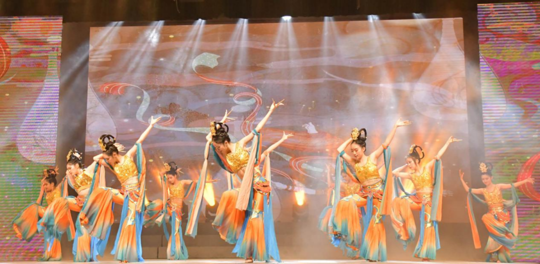 随着编钟的乐曲响起,舞蹈队新生翩翩起舞,为我们带来《清平乐 金銮月夜》;美妙绝伦的舞姿,极具敦煌特色的舞蹈服饰以及恰到好处的舞台灯光,仿佛让人置身璀璨的敦煌、置身那金銮月夜。