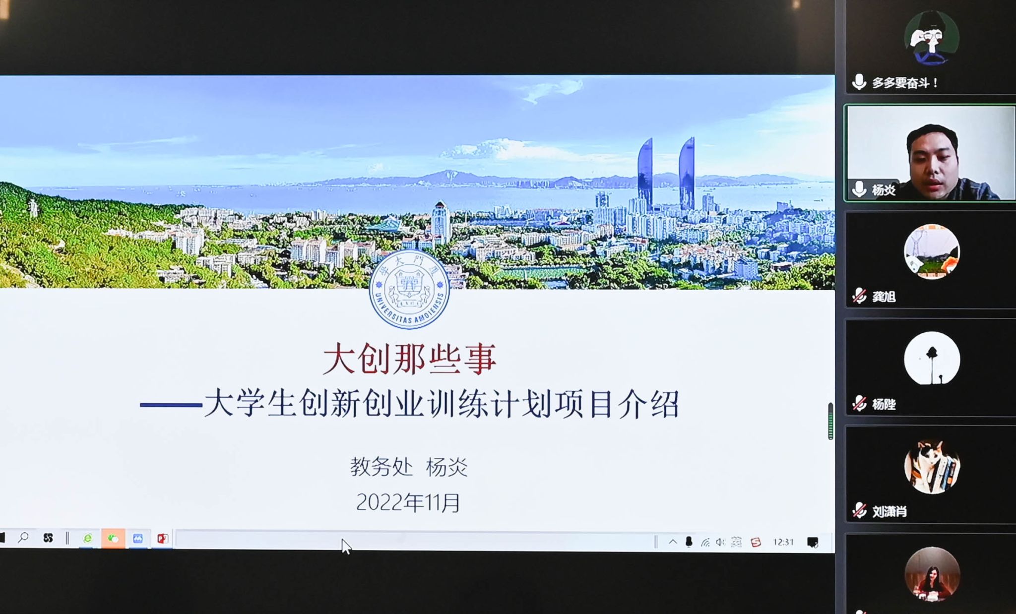12月9日,管理学院在嘉庚一100举办青年教师专场大学生创新创业训练(以下简称“大创”)说明会。管理学院党委副书记郑碧娇、管理学院财务学系副主任沈哲、厦门大学教务处杨炎、管理学院团委副书记王坤及青年教师代表线上线下参加了会议。会议由管理学院团委副书记揭上锋主持。