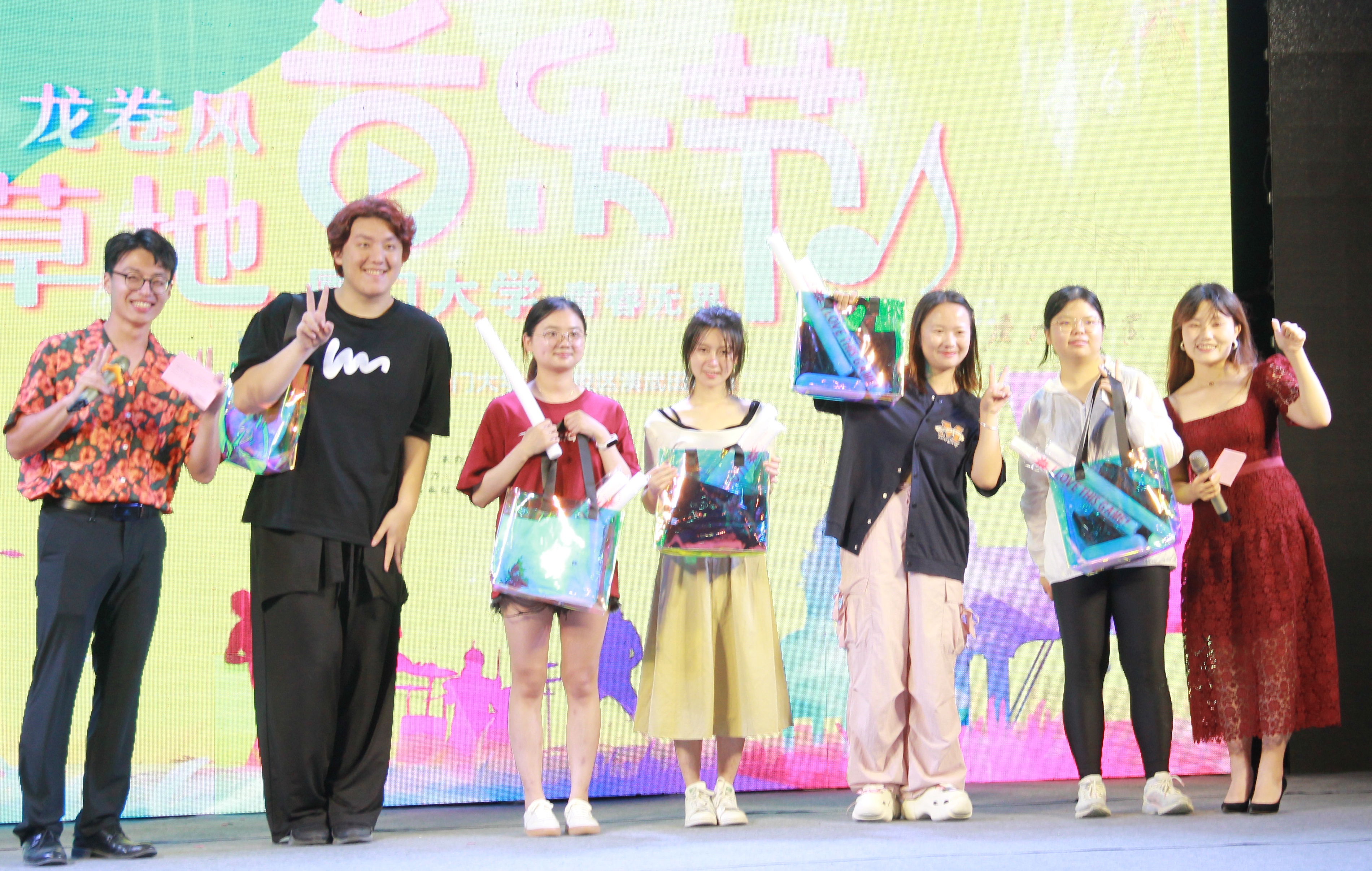 舞台上,音浪与蝉鸣共鸣,灯光与月色辉映,节目和选手轮番登场,从吉他弹唱到乐队演奏,从独唱到群舞,一个个跃动的音符,一曲曲动人的舞姿,是青春更是热爱;舞台下,同学们幕天席地,三五相伴,或跟着旋律挥舞着荧光棒,或踏着音乐节拍轻轻跟唱,或随着节目结束送上阵阵欢呼与掌声。节目间,穿插着“厦”门大吉和“击鼓传花”等互动环节,将中华优秀传统文化融入音乐节之中,环环相扣,主持人通过听歌识曲、猜曲唱歌等方式让各位观众深度参与,将音乐节气氛不断推向高潮。