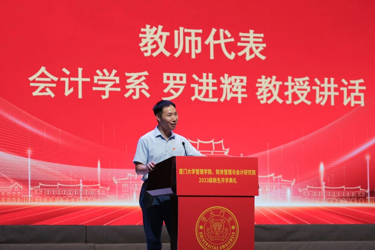 会计学系罗进辉教授代表学院教师发言。首先,他期待同学们做到“爱我所做,做我所爱”,心中有理想,脚下有力量,塑造自己的强项,突出自己的优势;其次是养成关心国家政治、经济、社会新闻的意识和习惯,拥有大胆、宏观的视野;最后,建议同学们要多锻炼、多运动,多与老师交流,争做身心健康的新时代接班人。他表示,将继续以“四有”好老师的标准要求自己,与同学们一起在厦大管院取得更好的成绩。
