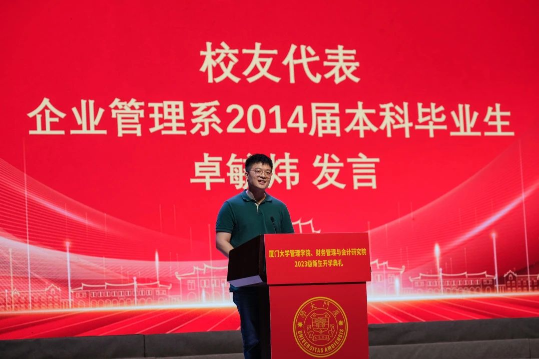 接着,企业管理系2014届本科毕业生卓毓炜发言。他通过分享自己大学生涯的三个故事来启发学弟学妹们。首先围绕“我为什么在这里”,鼓励学弟学妹们在大学历程中拥抱未知,追随自己的热情、直觉和好奇心;其次,提到热爱是动力的源泉,愿大家保持热爱,永远不要停下寻找热爱的脚步;最后通过“根本没这么多人在意你”的角度,告诉大家要做真实的自己,做想要成为的自己。