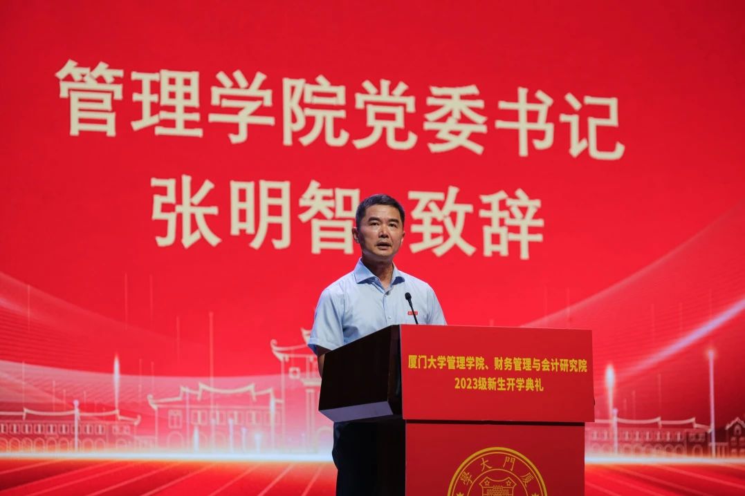 伴随着庄严的国歌声,开学典礼正式开始。张明智在致辞中首先祝贺并欢迎大家来到厦大这所具有光荣办学传统和深厚文化底蕴的百年学府,成为一名厦大商科人。希望同学们认真学习习近平总书记致厦门大学建校100周年重要贺信精神,弘扬光荣传统,赓续优良校风,践行“自强不息、止于至善”的校训,不负韶华、砥砺奋进,在中国式现代化建设中勇挑重任、挺膺担当。随后,他从三个方面对本硕博新生提出要求:一是励志勤学,争做切问近思、抱诚守真的求学者;二是锐意进取,争做不畏艰险、迎难而上的挑战者;三是躬行践履,争做心系人民、无私奉献的担当者。