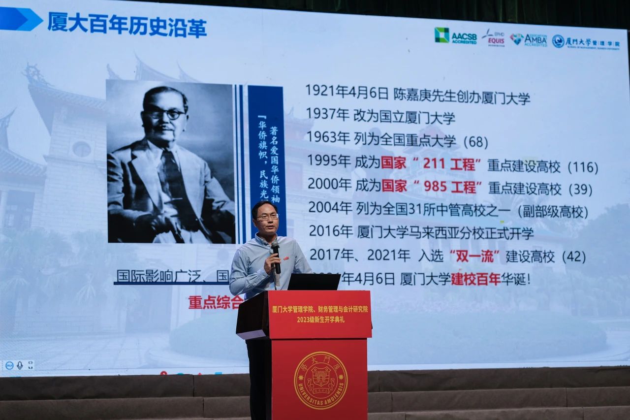 9月6日下午,厦门大学管理学院、财务管理与会计研究院2023级新生开学典礼在建南大会堂举行。管理学院党委书记张明智、院长吴超鹏教授、党委副书记郑碧娇,财会院副院长胡金帅教授,学院各系所中心领导、本科新生班主任、辅导员、教师代表及2023级全体新生出席开学典礼。典礼由管理学院党委副书记周民钦主持。