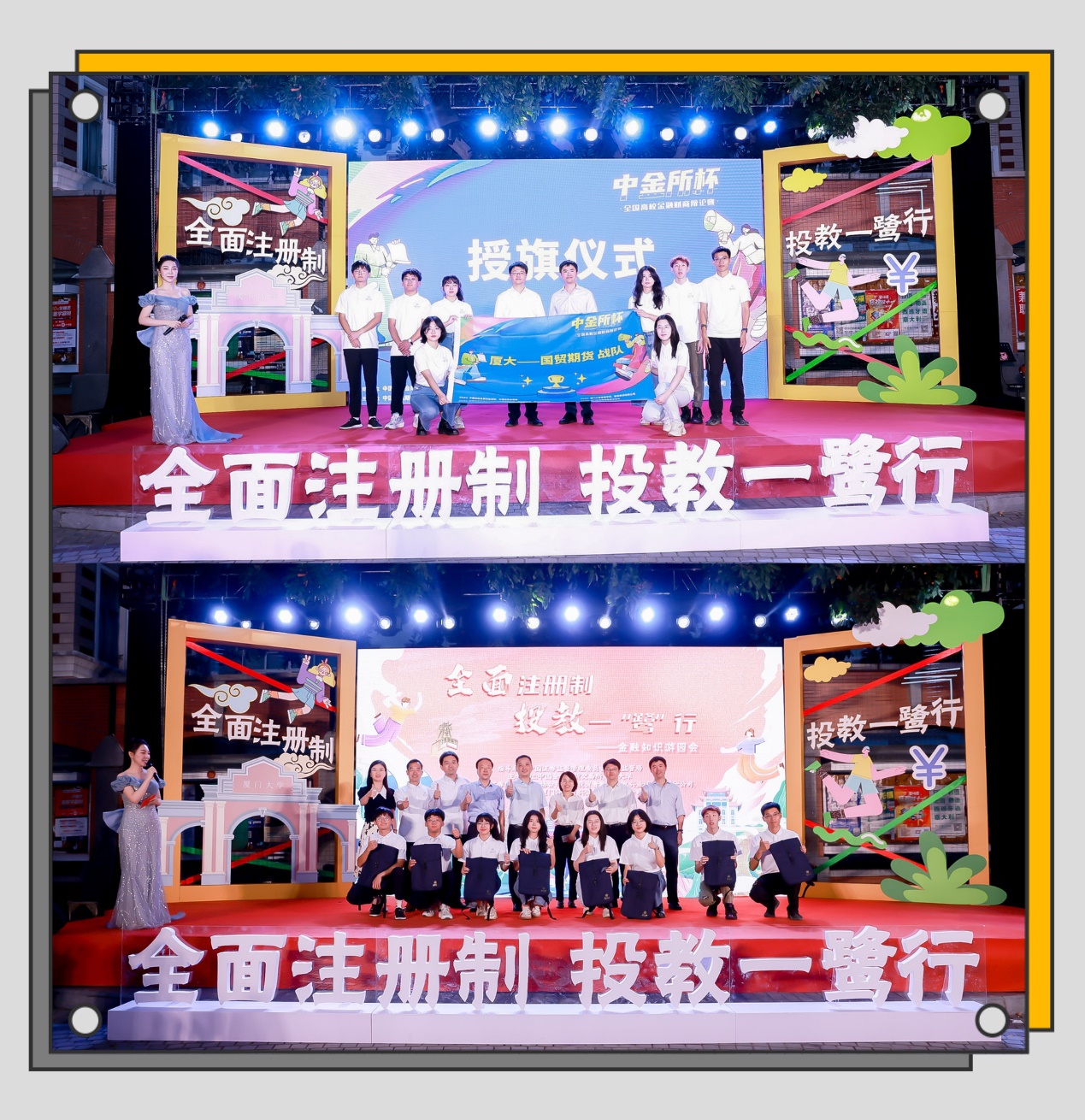 11月9日,在厦门证监局、厦门证券期货基金业协会及国贸期货有限公司等单位和现场观众的见证下,中金所投资者服务部及厦门大学管理学院领导向学生代表进行战队授旗仪式,相关领导及学生共同合影留念。