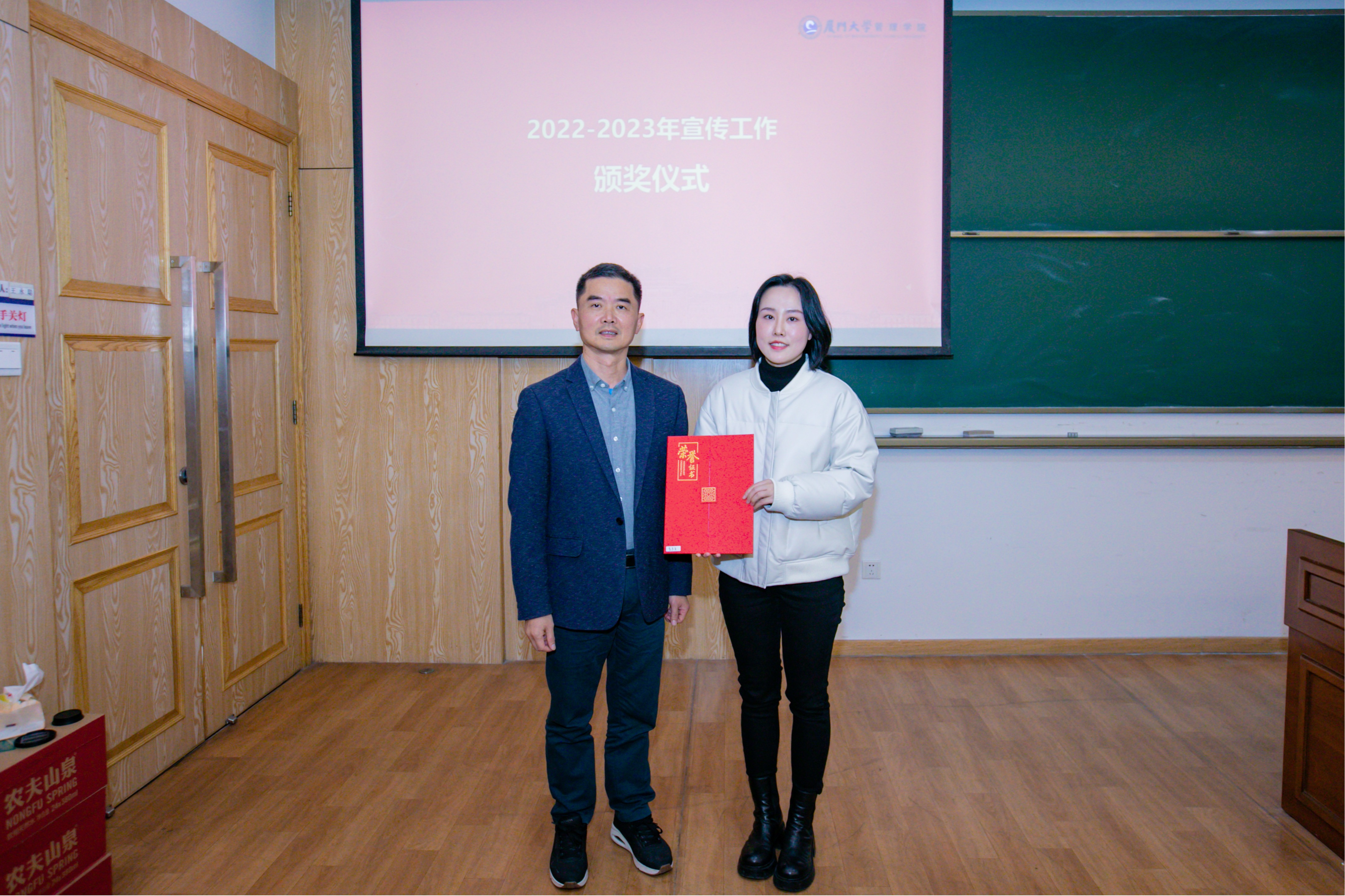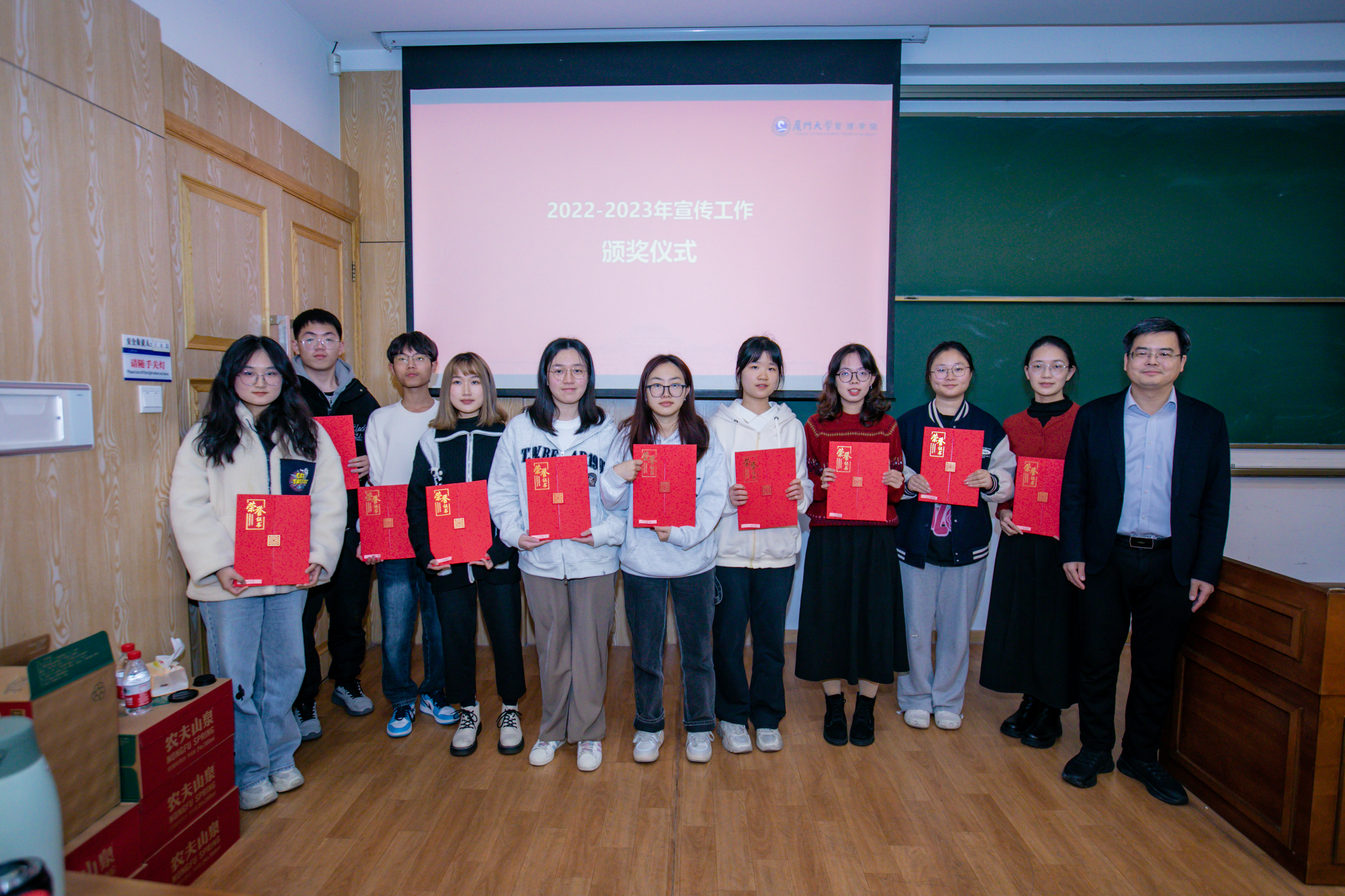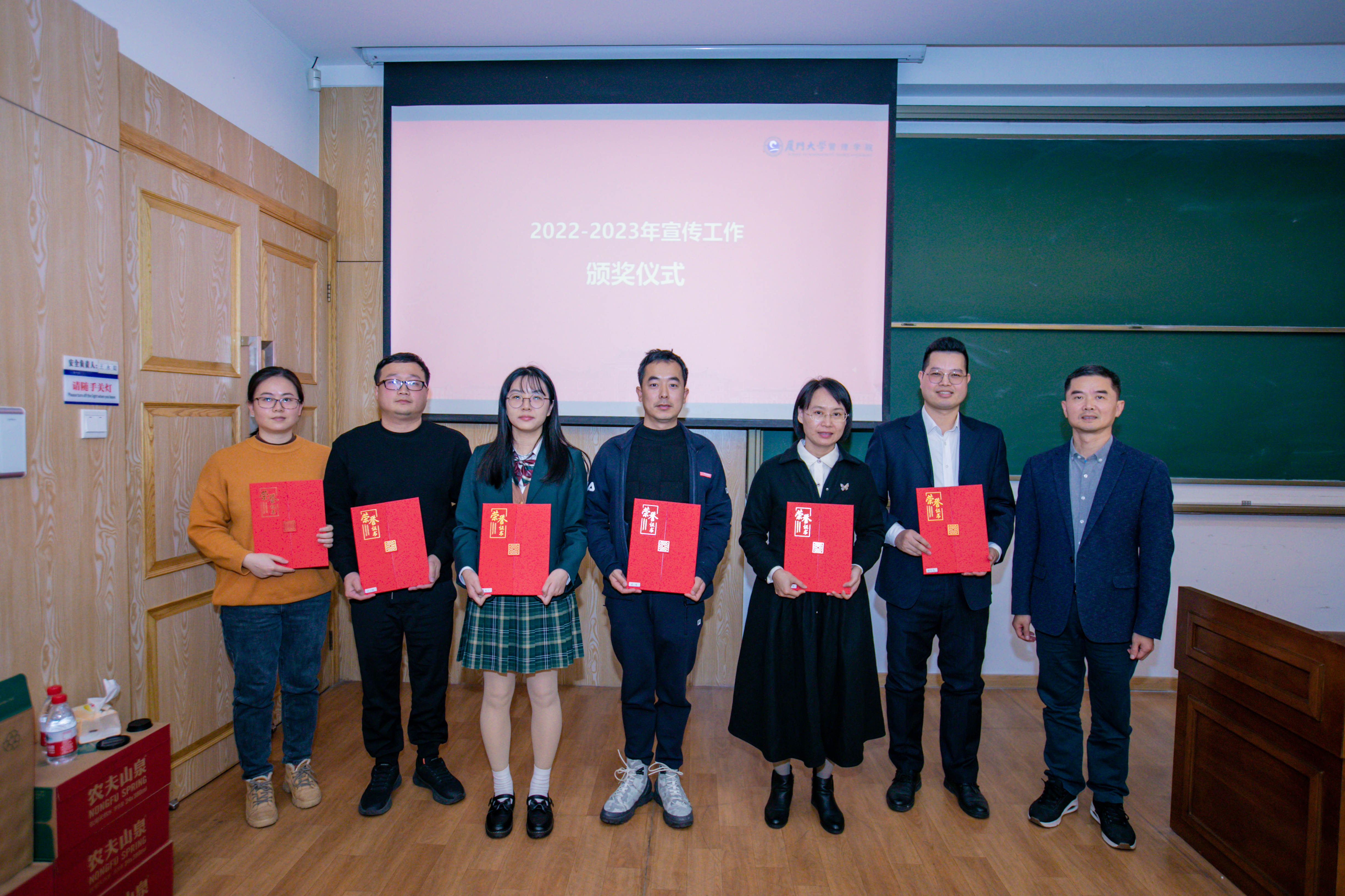 紧接着,郑碧娇宣读了《关于表彰管理学院2022-2023年宣传工作突出贡献奖、先进工作者、积极分子的决定》,授予曹惠真“2022年宣传工作突出贡献奖”,授予刘银燕、周子璇、龚晓文“2022年宣传工作先进工作者”称号,授予揭上锋、陈桂宝、林东富“2023年宣传工作先进工作者”称号,授予赵娅妮、李洁、刘佳鹭、李茹煊、钟海琳、王童“2022年宣传工作积极分子”称号,授予朱诗彤、张玮、欧力菲、林炜薇、龚诗珩、谢甘毅、钱秋欢“2023年宣传工作积极分子”称号。张明智、周民钦分别为荣获“宣传工作突出贡献奖”和“宣传工作先进工作者”的教职工、荣获“宣传工作积极分子”的学生颁奖并合影留念。
