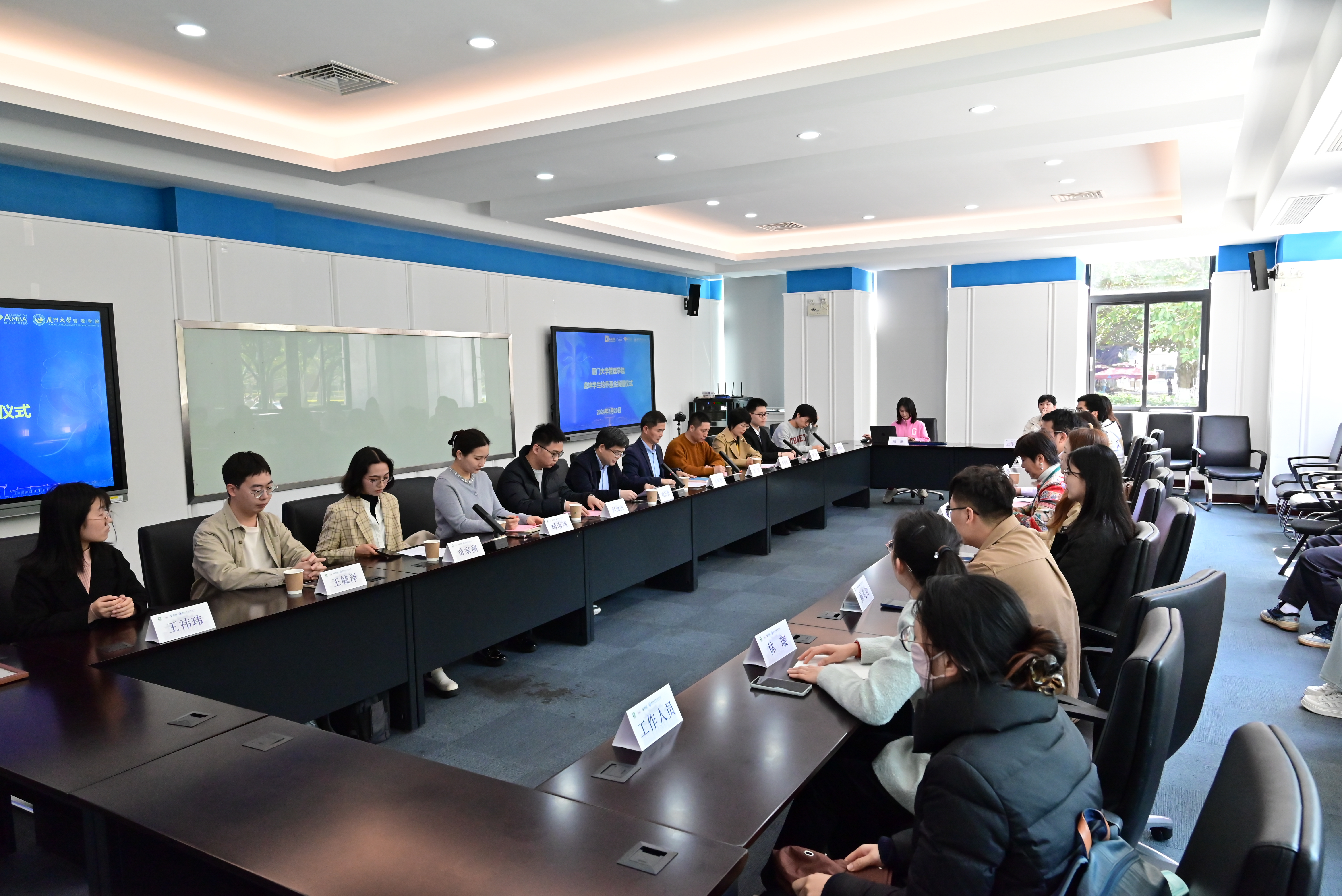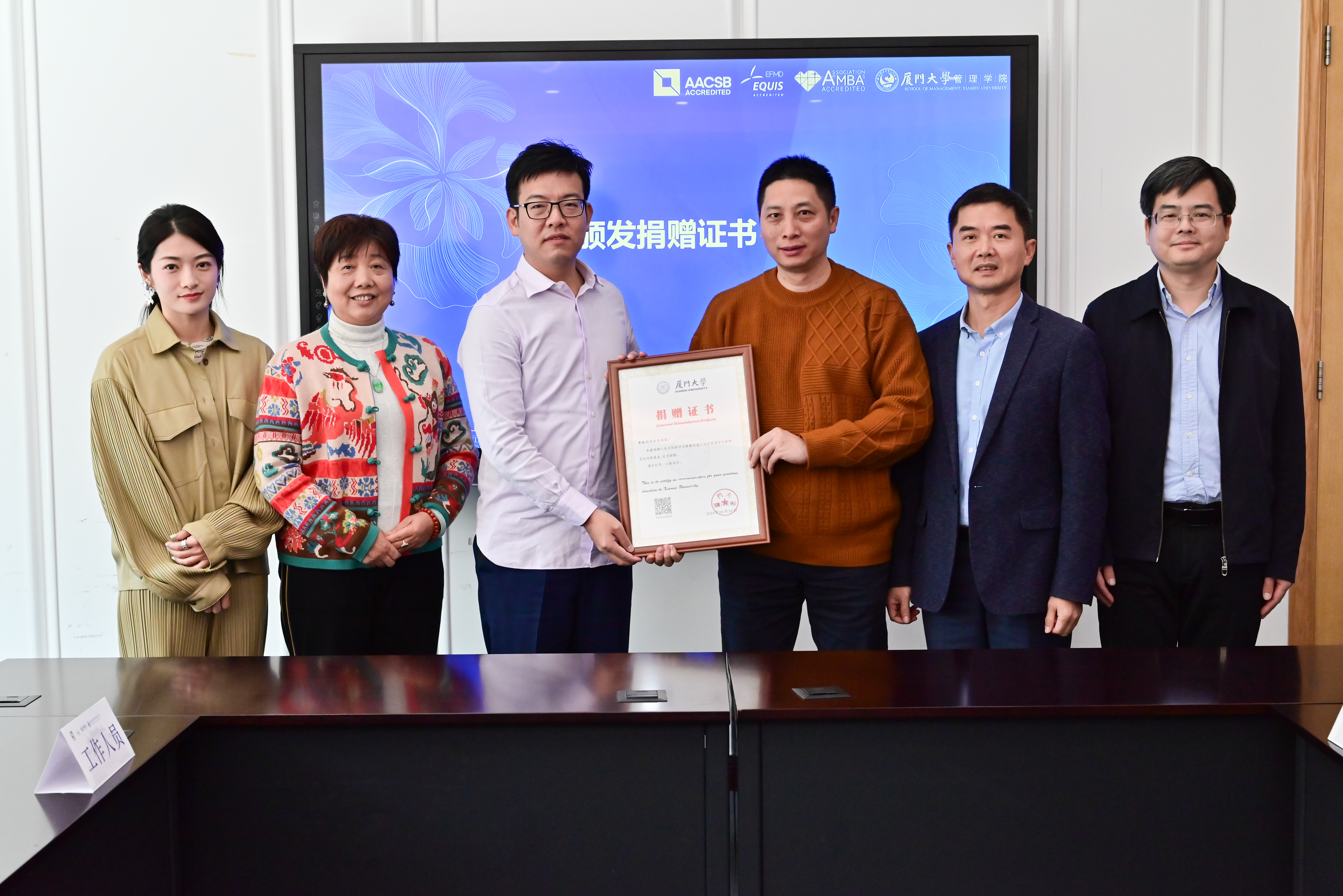 在厦门大学建校103周年华诞来临之际,管理学院2012级EMBA校友、厦门鼎坤集团有限公司董事长郑永志先生捐赠50万元人民币在管理学院设立“鼎坤学生培养基金”。3月20日上午,管理学院在保欣丽英楼100会议室举行捐赠仪式,郑永志校友及家人黄颖、林丽琼,厦门大学管理学院党委书记张明智、教育发展基金会秘书处副秘书长徐滨、管理学院团委书记蒋超杰、辅导员赵梁杰、校友工作秘书杨南燕以及学生代表出席。