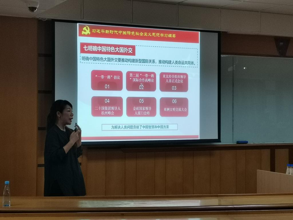 洪秋霞从“习近平新时代中国特色社会主义思想是党和国家须长期坚持的指导思想”“习近平新时代中国特色社会主义思想‘八个明确’的主要内容解读”“习近平新时代中国特色社会主义思想‘十四个坚持’的主要内容解读”及“习近平新时代中国特色社会主义思想是经过实践检验、富有实践伟力的强大武器”四个方面展开讲述。她指出,习近平新时代中国特色社会主义思想承载着中国共产党人的初心和使命,要深刻理解这一思想的基本精神、基本内容、基本要求,做到学思用贯通、知信行统一,紧密结合新时代赋予高校教师的使命,有针对性地学习,知其然又知其所以然,增进我们对完善和发展中国特色社会主义制度、推进国家治理体系和治理能力现代化等重大现实问题的理解,不断提高运用科学理论指导实践、推动工作的能力。