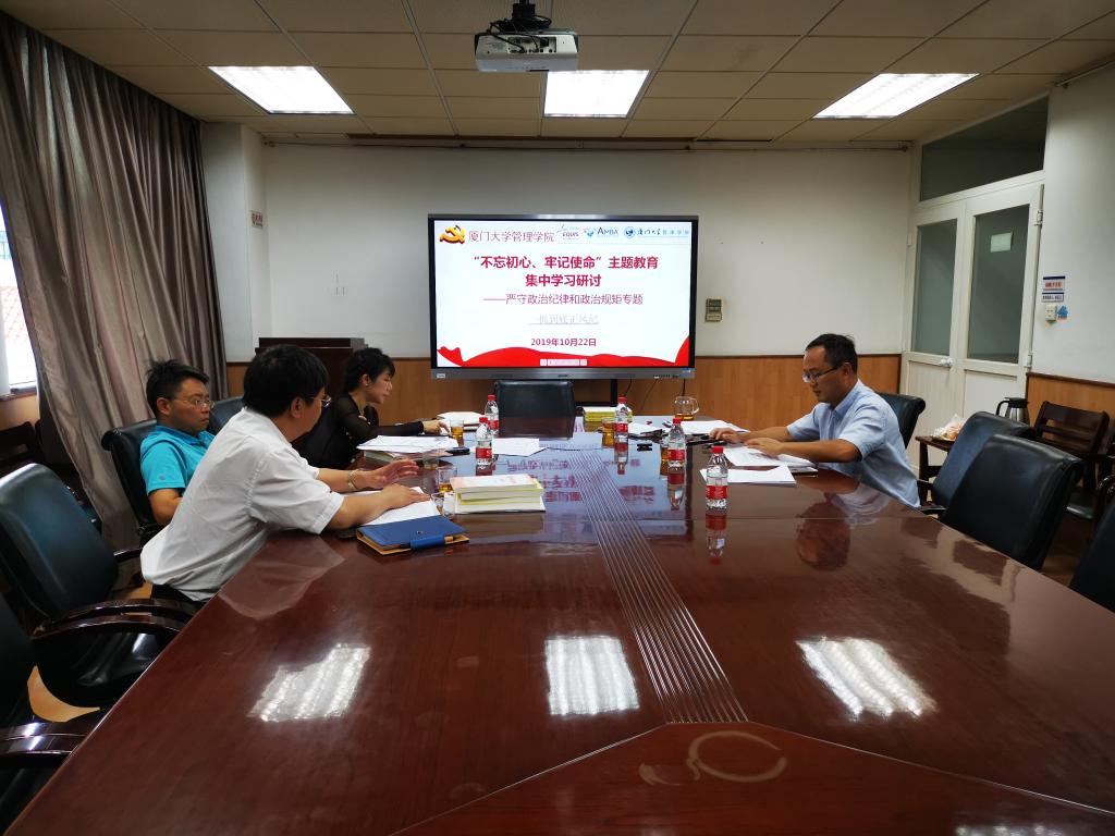10月22日中午,管理学院党员领导干部围绕“严守政治纪律和政治规矩”专题进行“不忘初心、牢记使命”主题教育第五次集中学习研讨。院党委副书记戴蓥主持学习会。