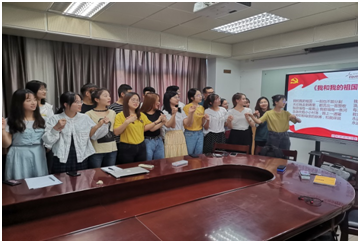 礼赞新中国,奋斗新时代。2019年是中华人民共和国成立70周年,是全面建成小康社会、实现第一个百年奋斗目标的关键之年。活动的第一环节,支部全体党员一起回顾了党的奋斗历史,在这艰辛却坚定不移的发展过程中,我们党适应新形势,抓住机遇,一步一步地朝着正确的方向前行。主持人丁颖洁同志深情讲述:“70年砥砺奋进,我们的国家发生了翻天覆地的变化,无论是在中华民族历史上,还是在世界历史上,这都是一部感天动地的奋斗史诗,”她回顾道,“五千年的历史蕴含和沉淀,七十年的继承,如今,党的十九大的春风吹来,新一代的中国领导人正继往开来带领中华民族走向新的辉煌,从四十年前的改革开放再到如今的‘一带一路’,新中国一直坚定不移地在中国特色社会主义道路上前行,在国际舞台上焕发光彩,体现大国担当。”支部成员们随着她的声音渐渐深入到这一艰难的奋斗历程当中,更加深刻地体会到革命前辈们坚定的理想信念与伟大斗争精神,激发出更加强烈地为新时代奋斗努力的爱国之情。