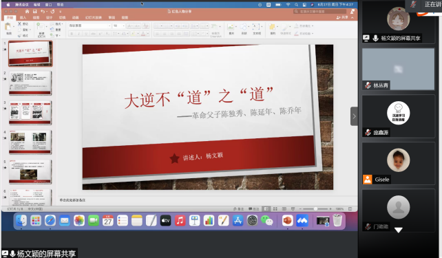 之后,杨文颖同志分享了故事“大逆不‘道’之‘道’——革命父子陈独秀、陈延年和陈乔年”。陈独秀一生做出了许多杰出贡献:他是五四运动的总司令,是马克思主义的积极传播者,创办了《新青年》这一中国近现代历史上影响最大的刊物,教育、引导了整整一代人。作为一名革命英雄,陈独秀为了信仰做出了许多牺牲,并且一生都在亏欠家庭的愧疚之中。而他的儿子陈延年和陈乔年,坚毅、有骨气、正义、独立,从不畏强权和权威。虽然前期不能理解父亲的舍家为国,后期却也义无反顾走上革命道路,最终壮烈牺牲。