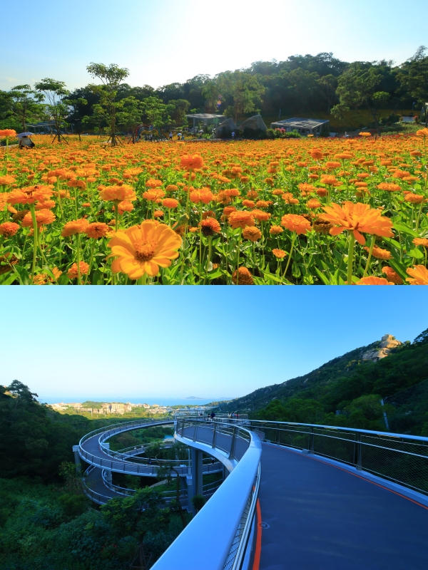 林海线二期主要沿岛内南部的自然山体东坪山,穿越城区高密度住宅区、商业区,连接山体公园、水域绿地,与城市慢道系统和现有山体步道系统串联。