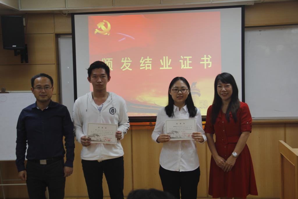 随后,郑冰冰书记、傅伯奇副书记为学员代表张雨馨、杨忠颁发结业证书并合影留念,洪秋霞副书记、戴蓥副书记为学员代表陈怡婷、付芸颁发结业证书并合影留念。