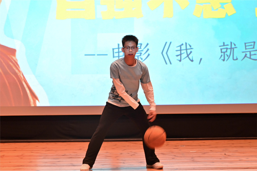 张家城在现场还展示了运球和转体上步等动作,精湛的篮球技术引起现场观众的阵阵喝彩。