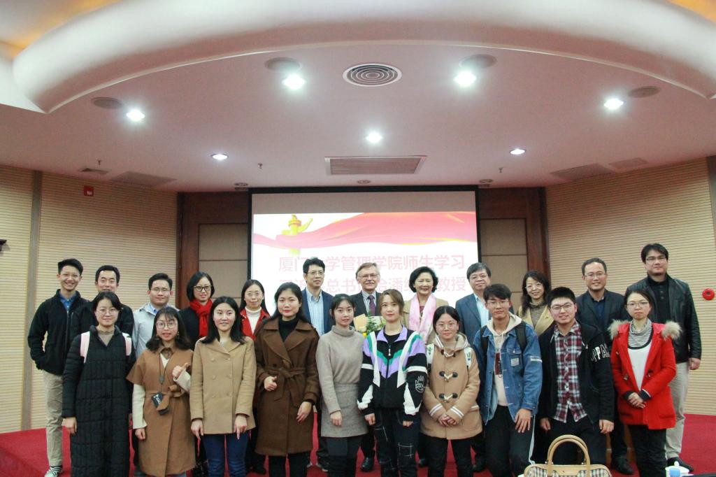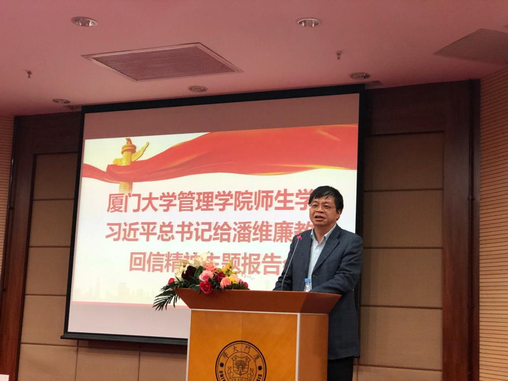 3月7日晚上,我校管理学院在克立楼报告厅举办师生学习习近平总书记给我校潘维廉教授回信精神主题报告会。报告会上,在场师生在管理学院院长叶建明的带领下,共同学习了习近平总书记的重要回信精神,随后潘维廉教授以“为什么《我不见外》”为主题,分享了自己所经历的中国改革开放30年的所见所闻、所感所想。厦门大学原副校长、校友总会副理事长詹心丽,管理学院党委书记邱七星,院长叶建明以及管理学院党委委员、各系、所(中心)负责人、教工党支部书记、支委和师生代表共同出席了报告会。报告会由管理学院党委副书记戴蓥主持。