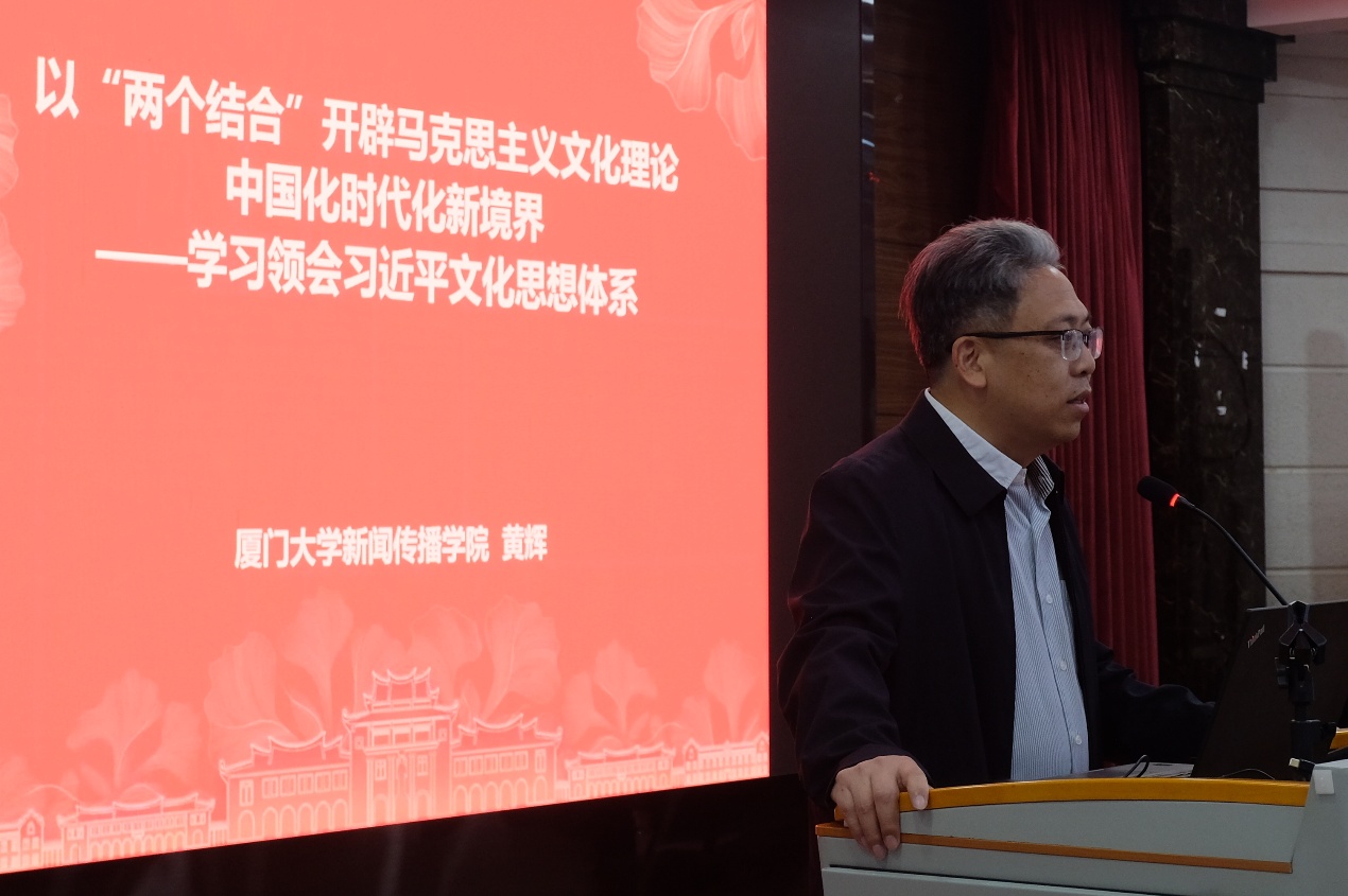 黄辉作题为《以“两个结合”开辟马克思主义文化理论中国化时代化新境界——学习领会习近平文化思想体系》的报告。黄辉首先为学员们梳理了“两个结合”、马克思主义中国化时代化、文化等几个关键概念。他提出,以“两个结合”推进马克思主义中国化时代化,使马克思主义在时间与空间上实现了新的飞跃。随后,黄辉深入解读了习近平总书记在新时代文化建设方面的新思想新观点新论断,并对照《习近平文化思想学习纲要》,系统阐释了习近平文化思想的核心要义、精神实质和丰富内涵。报告最后,黄辉号召学员们持续加强对习近平文化思想的学习,在真学真懂真信真用上下功夫。报告内容深入全面,为学员们带来了深刻的启发。