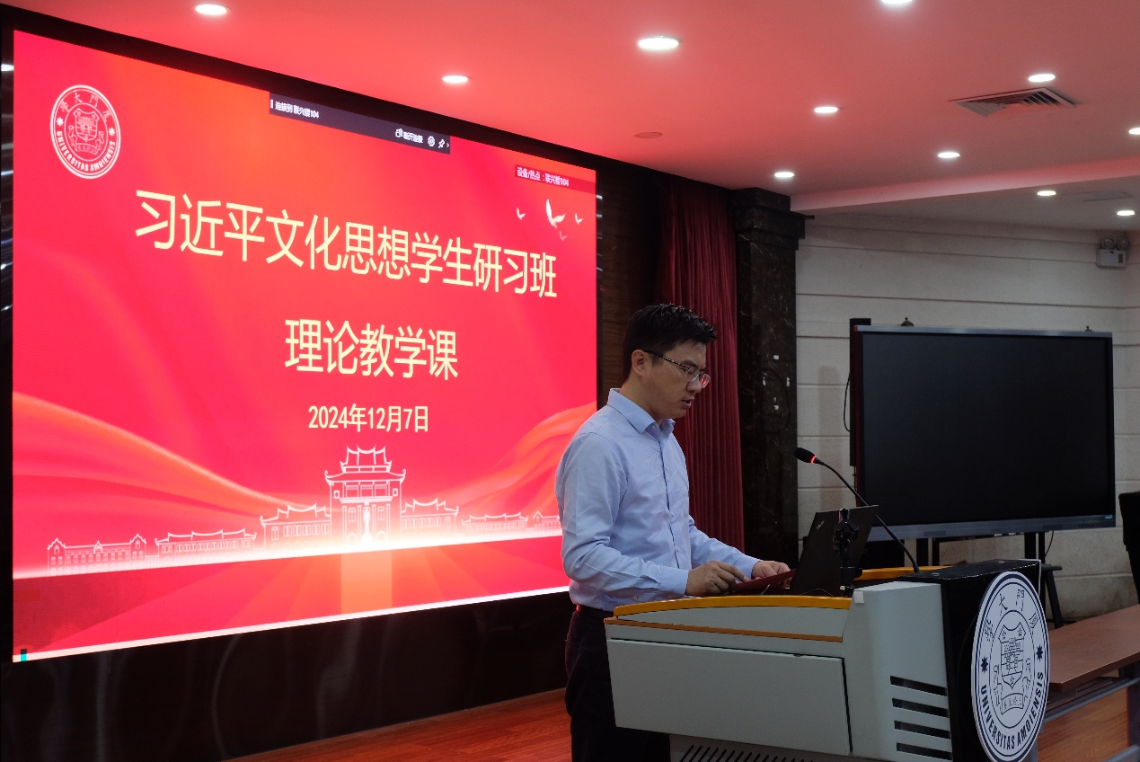 为持续学习贯彻习近平总书记在新时代文化建设方面的新思想新观点新论断,深化学生对习近平文化思想的理解和认同,12月7日上午,由管理学院、历史与文化遗产学院、新闻传播学院和国际中文教育学院/海外教育学院牵头组织举办的习近平文化思想学生研习班在联兴楼104报告厅举行了第二次理论教学课。