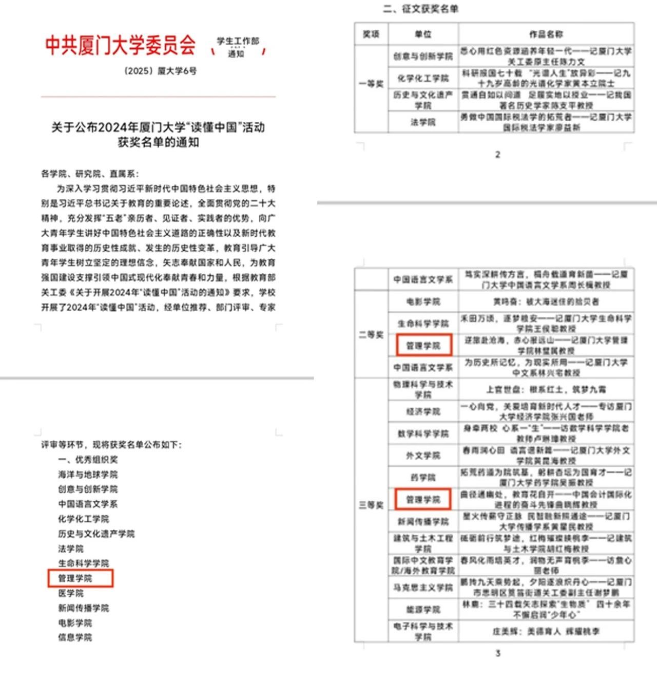 近日,厦门大学2024年“读懂中国”主题活动评选结果揭晓,我院在征文与短视频双赛道中表现卓越,斩获两项二等奖、一项三等奖,同时荣获优秀组织奖。