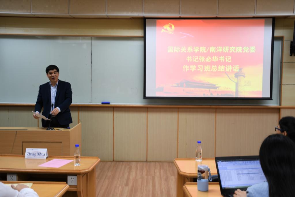 之后,国际关系学院/南洋研究院党委书记张必华作学习班总结讲话。张必华书记首先对本次党校的组织学习情况进行了全面而又深入的总结,在对党校教学成果表示肯定的同时也对大家寄予厚望。希望大家能够在今后的学习、工作和生活中,知行合一,真正做到以这次党校学习作为新的起点,进一步加强理论学习,坚定理想信念,不断端正入党动机,争取早日在思想上、组织上加入中国共产党,成为一名光荣的共产党员。张书记的讲话赢得了在场老师、同学们热烈的掌声。
